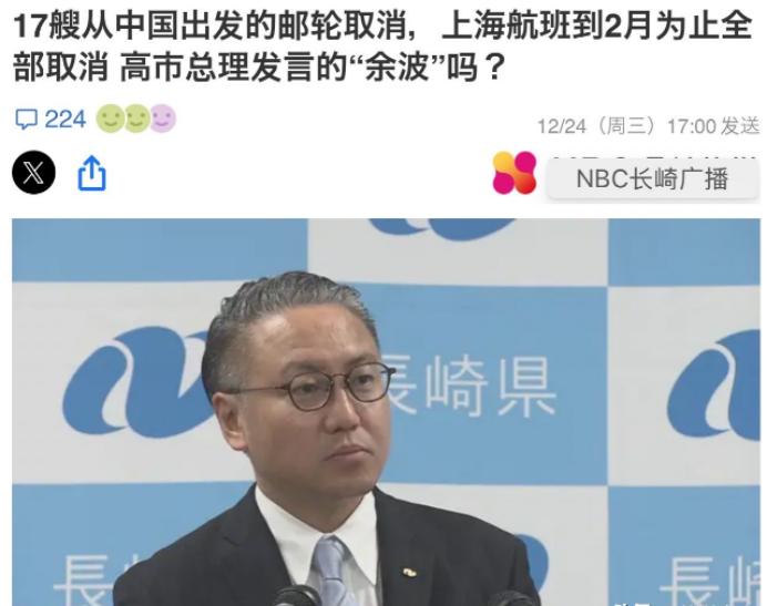 日本彻底坐不住了!12月24日,日媒消息称,长崎县知事大石23日在例行记者会上证实,往返中国的游轮及团体旅游项目近期接连取消。明年1月、2月航班亦被全数叫停。 说白了,这件事还是和日本“涉台”言论脱不了干系。 要知道,台湾是中国的一部分,两岸统一是全体中华儿女的夙愿,而日本的“涉台”言论,触犯的是中国的底线。如果说明年1月、2月航班亦被全数叫停,是中国的反制措施,那么累计17艘去往日本的旅游团取消,就是中国人民的自发的选择,毕竟,任何一个人都不愿意花钱去一个不尊重自己国家主权的地方。 说实话,日本这样的做法,最终损害的是自己国家和人民的利益,反观中国并未受到影响,中国的旅游团取消,转头就飞去了俄罗斯,让俄罗斯的经济实现了回暖。 说到底,日本的损失是自找的,如果日本还停止“涉台”挑衅、主动道歉,后续中国可能还会在反制措施上加码,到时候日本的经济损失只会越来越大。