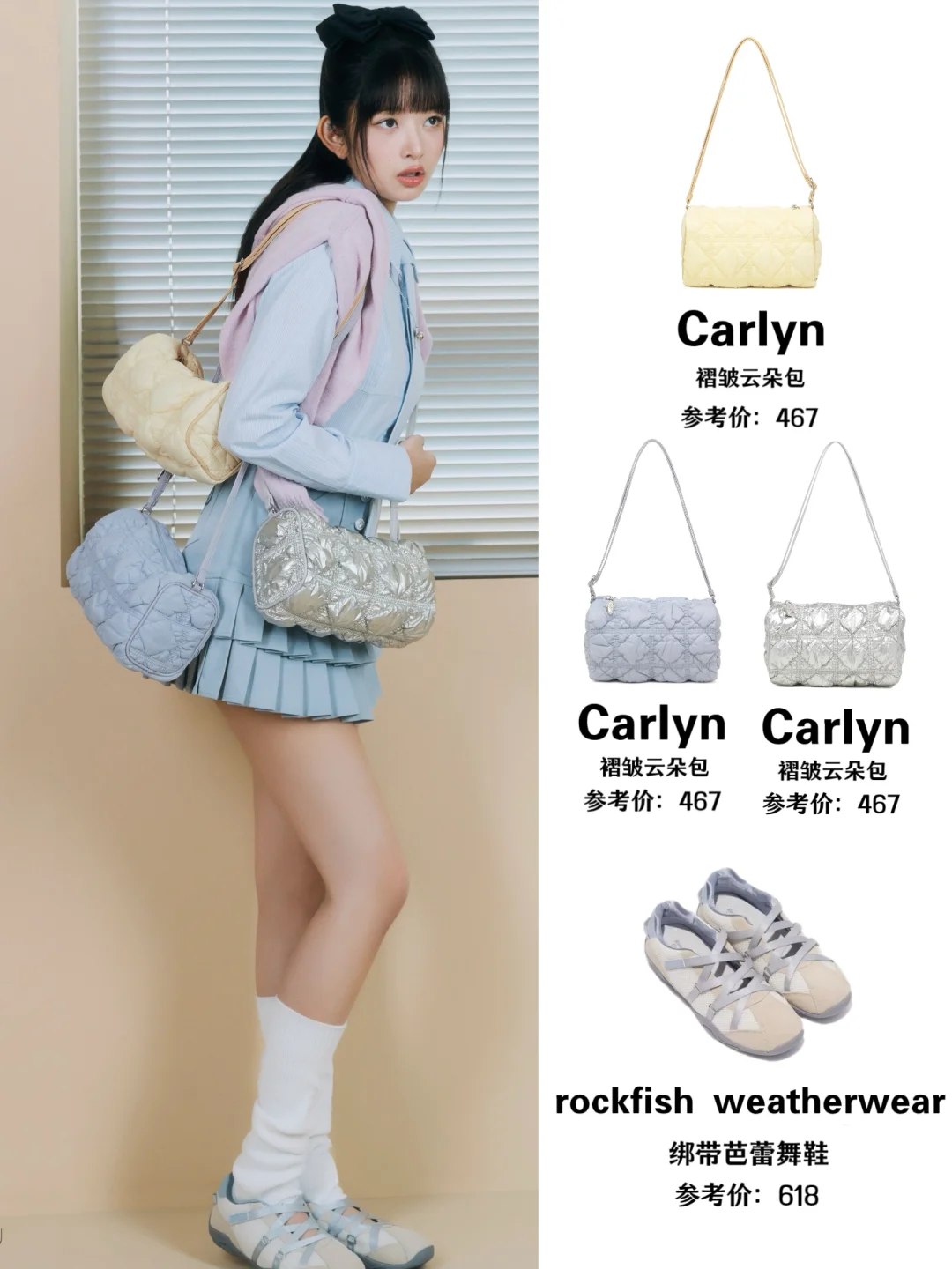 夏日出游的脚步越来越近啦~这次我直接抄作业,get了超火的rei同款穿搭,尤其是搭配的两款Carlyn家的包,真的绝,甜美又不失休闲感,拍照超出片! 容量超大的手提包,能装下出游的各种小零碎。搭配印花短袖t恤和波点短裙,俏皮又灵动。 造型别致的云朵包,看起来就像一朵软乎乎的云朵,出游背它,无论是漫步在海边,还是穿梭在古街小巷,都能轻松成为焦点,夏日氛围感狠狠拿捏! 图源来自:网络