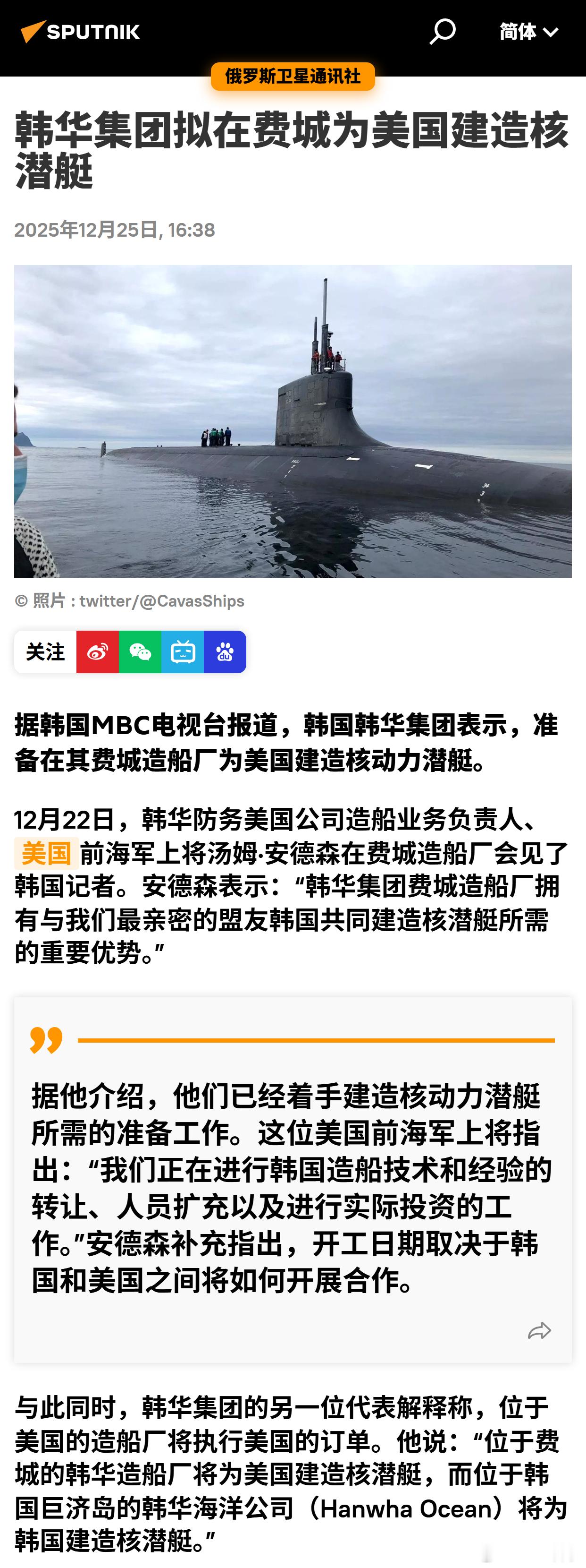 韩华集团拟在费城为美国建造核潜艇