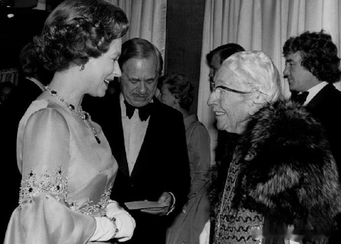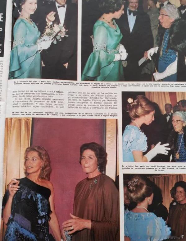 1974年,《东方快车谋杀案》电影首映式。图1:阿加莎·克里斯蒂坐在轮椅上出席活动,这也是她生前最后一次公开露面。图2-3:阿加莎·克里斯蒂和伊丽莎白二世。伊丽莎白二世及其妹妹玛格丽特公主、母亲伊丽莎白王后、奶奶玛丽王后几代人均是阿加莎书迷。图4:从左至右:安妮公主,阿加莎·克里斯蒂及其丈夫马克斯·马洛温。图5:伊丽莎白二世和安妮公主母女俩。图6:伊丽莎白二世和菲利普亲王。图7:从左至右:演员约翰·吉尔古德,劳伦·白考尔,阿尔伯特·芬尼。在影片中扮演波洛的芬尼被提名了当届奥斯卡影帝。图8:劳伦·白考尔和英格丽·褒曼。英格丽褒曼凭借扮演的Greta获得奥斯卡最佳女配,这也是她职业生涯捧得的第三座奥斯卡小金人。图9:当年的杂志报道。