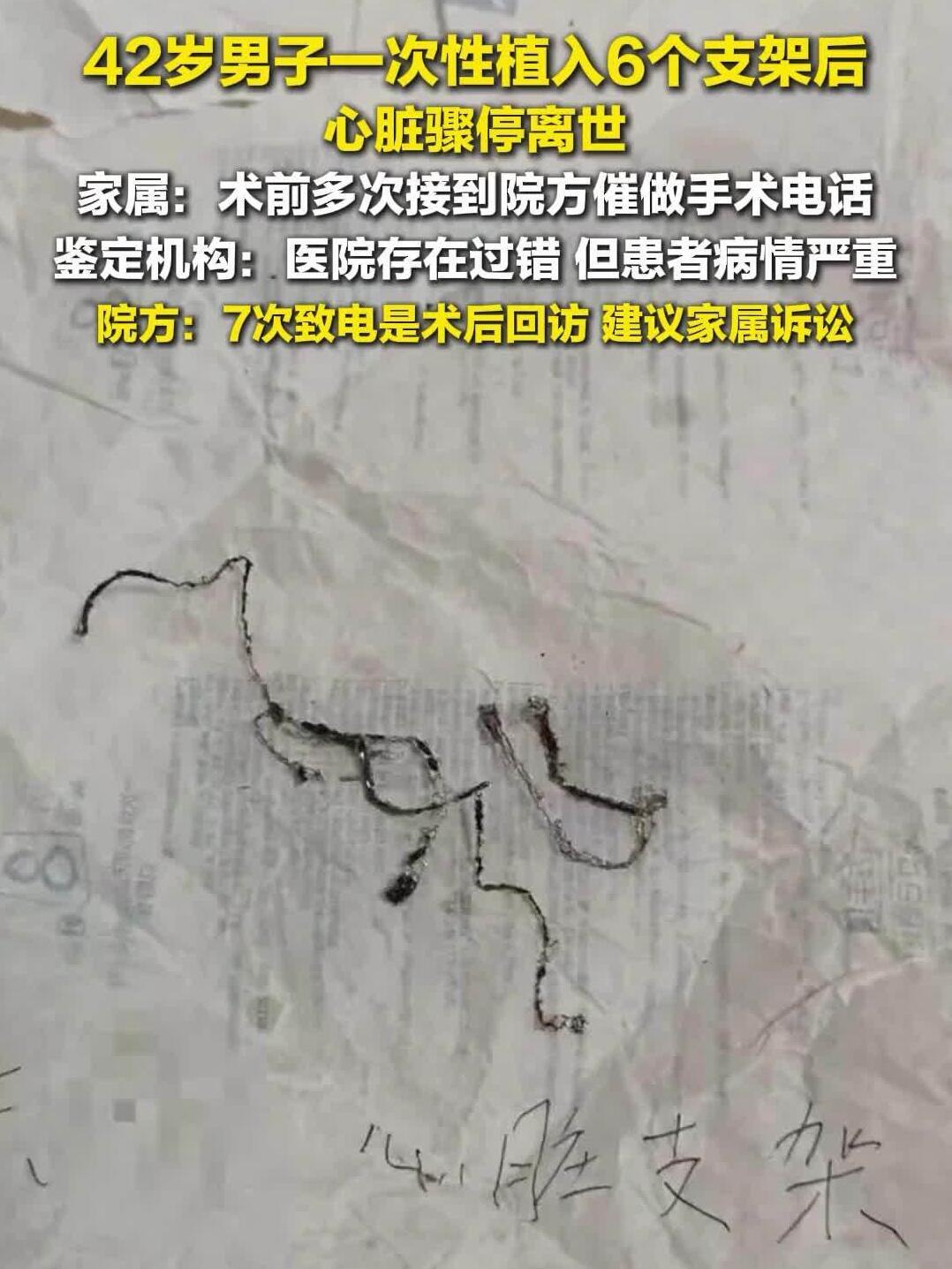 这事儿真让人揪心。陈先生一个平时没啥感觉的人,最后因为一次装心脏支架的手术人没了,放谁家都受不了。 医院从4月到7月,用同一个号码打了7次电话叫他来做手术,手术前5天还打了一次。别说家属了,外人听着也觉得不对劲,像不像那种“推销”或者“催单”?要是人真的必须做手术,医生通常会交代清楚病情、手术的必要性和风险,然后让病人自己决定。这么频繁地打电话“邀请”,确实容易让人怀疑是不是为了完成指标或者别的原因。 再说手术本身,一次性给心脏放了6个支架,这个数量本身就挺惊人的。术后半小时心脏就出问题了,很难不让人把这两件事联系到一起。医院方面后来承认,没有充分评估陈先生到底是不是真的有必要、必须马上做这个手术,这是他们的问题。 当然,陈先生自己心脏可能也确实有点老毛病,鉴定报告也提到了这点,说这增加了手术风险。所以这事儿很可能不是单一原因造成的,而是多种因素碰在一起导致的悲剧。 家属现在不接受对半分责的调解方案,心情完全可以理解。他们不仅要面对失去亲人的痛苦,还得面对一堆说不清道不明的疑问:为什么一直打电话催?为什么主刀医生换了?为什么一次性放那么多支架?这些疑问得不到清晰、合理的解释,换谁都难以平息。 说到底,这件事里医院的嫌疑很难洗清。频繁电话催促手术、指征评估不足,这些行为本身就偏离了医疗的初衷。医疗应该是以病人的实际需要和安全为第一位,而不是其他任何东西。希望这件事能查个水落石出,既给家属一个交代,也给所有人提个醒,让类似的事情别再发生了。