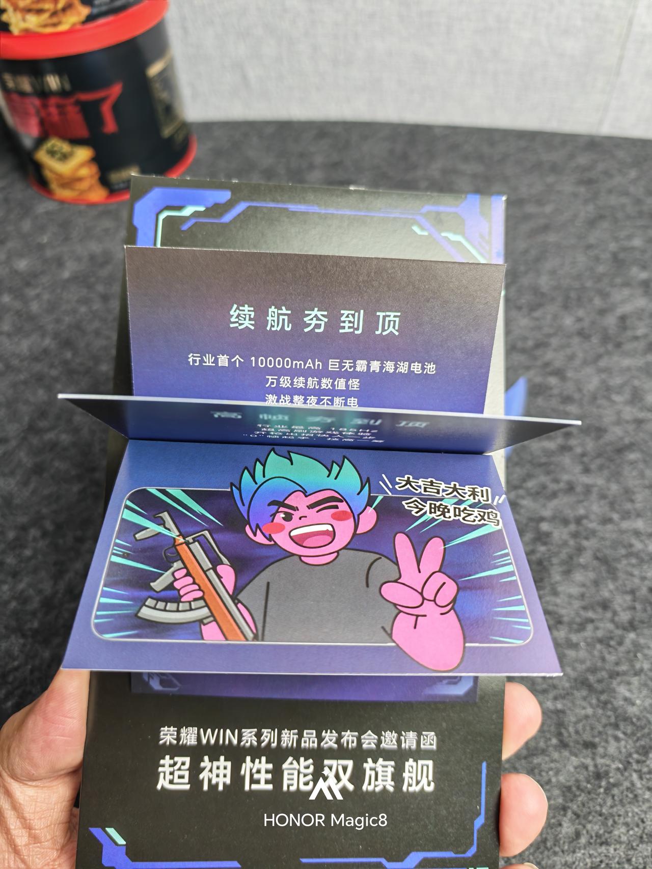 收到荣耀WIN「嬴证」邀请函 说起玩梗,荣耀现在是大师,把发型戴到笑脸上会大喊一句 赢麻了, 毕竟,这次有185hZ超高刷屏幕,和10000mAh超大电池,性能夯到顶、散热夯到顶、续航夯到顶、高帧夯到顶、体验夯到顶… 坐等荣耀WIN系列超神性能双旗舰新品发布会啦