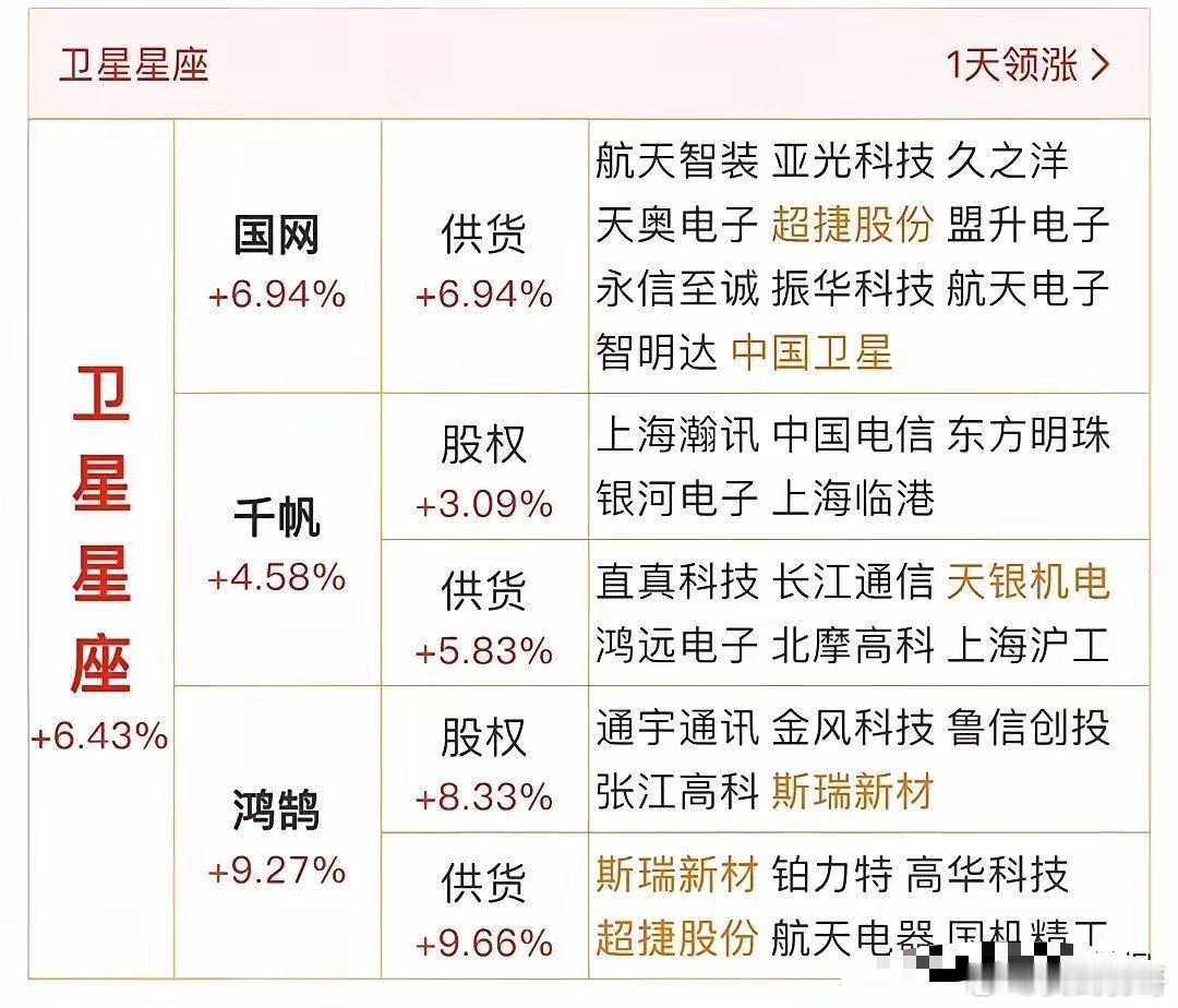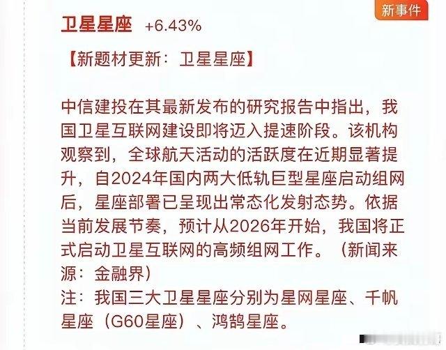卫星星座三大板块梳理!近日,中信建投研报指出,我国卫星互联网建设即将迈入提速阶段,2026年将正式启动高频组网工作。国内星网、千帆(G60)、鸿鹄三大卫星星座的发展按下加速键,卫星互联网赛道迎来新机遇,相关概念龙头代表有哪些?~千帆(G60)星座又称“G60星链计划”,是中国版“星链”的核心组成部分,上海垣信卫星科技有限公司主导运营。作为我国第二个低轨卫星大星座,相关产业链龙头代表有直真科技、银河电子、上海瀚讯等等。鸿鹄星座是我国三大卫星星座之一,聚焦于低轨宽带通信卫星系统建设,是我国卫星互联网布局的重要组成部分。与之高度关联的公司有航天电器、通宇通讯等等。理财有风险投资需谨慎,资料全网公开可查仅供参考不能作为投资依据。