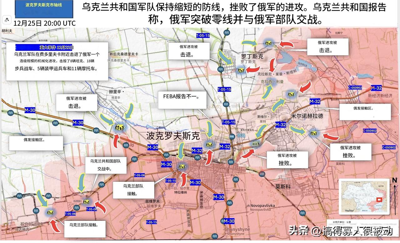 乌军在波克罗夫斯克北部坚守关键防御阵地,并继续争夺市中心。过去几天俄军的进展虽小且代价高昂,主要集中在米尔诺赫拉德及附近的防风林。之前,俄军尝试在波克罗夫斯克北部和多布罗皮利亚方向发动大规模装甲推进,但均遭重创。此外,乌军加强了米尔诺赫拉德以西的后勤路线。 总体而言,波克罗夫斯克局势对乌军来说虽然艰难,但已经得到了控制。