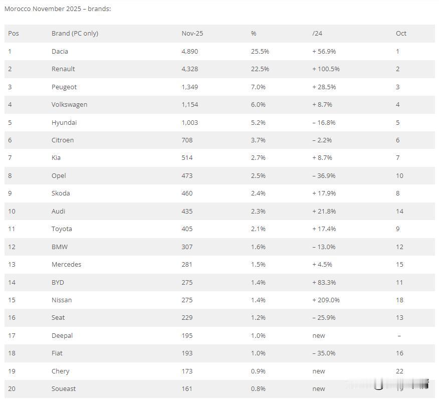 11月,摩洛哥车市,中国汽车销量详情! 大家好,这里是极速车情。今天为大家带来摩洛哥汽车市场11月份的销量数据报告。 2025年11月,摩洛哥新车销量同比暴增36.5%,至21603辆。这是市场连续第11个月实现至少 20%的同比增长,且年度累计销量已达208018辆。 新入局中国品牌:长安深蓝本月首次上榜即位列第 17 位,份额达 1%;近期上市品牌中,奇瑞(第 19 位)、东南(第 20 位)表现突出;零跑汽车(第 31 位)、领克(第 42 位)同步新进市场。 中国品牌表现: 比亚迪:275辆,市占率1.4%。 长安深蓝:195辆,市占率1%。 注:奇瑞系:355辆,市占率1.8%。 奇瑞:173辆,市占率0.9%。 奇瑞东南:161辆,市占率0.8%。 长城:161辆,市占率0.8%。 名爵:133辆,市占率0.7%。 长安:119辆,市占率0.6%。 吉利:80辆,市占率0.4%。 东风小康:68辆,市占率0.4%。 零跑:65辆,市占率0.3%。 东风:35辆。 奇瑞Jaecoo:17辆。 吉利极氪:17辆。 吉利领克:13辆。 奇瑞Omoda:4辆。