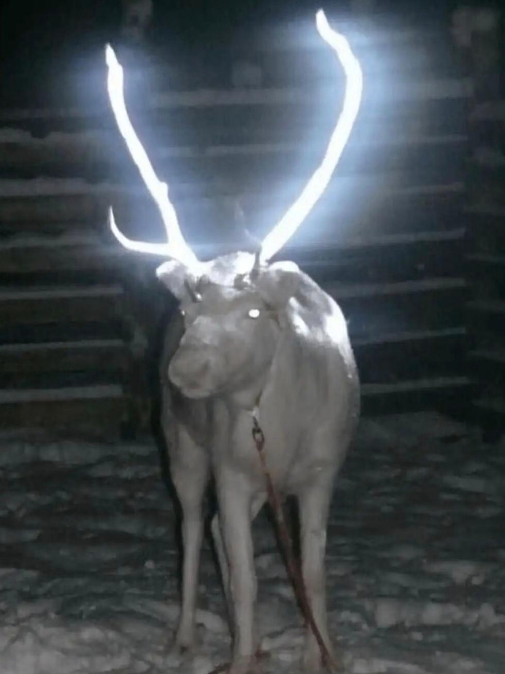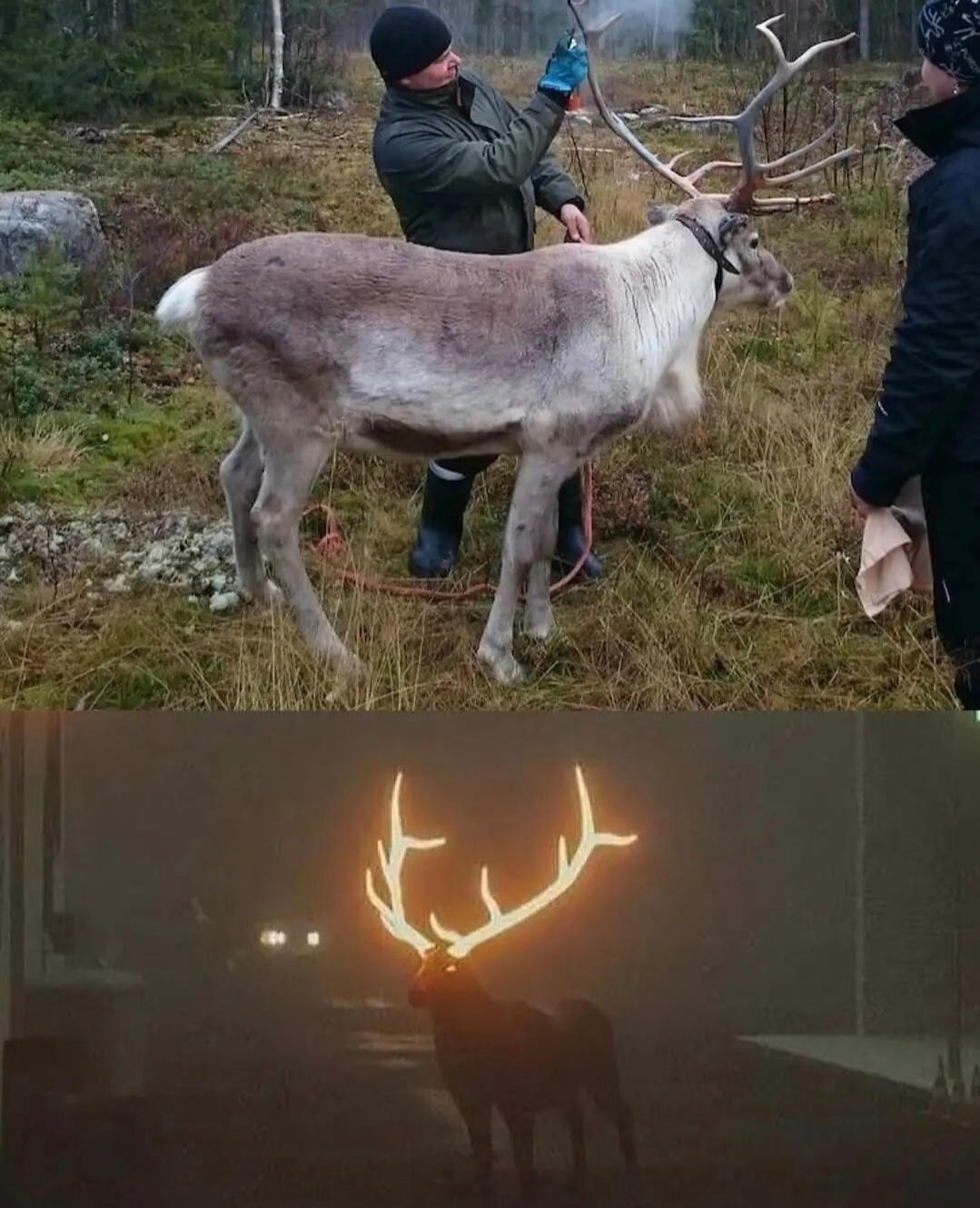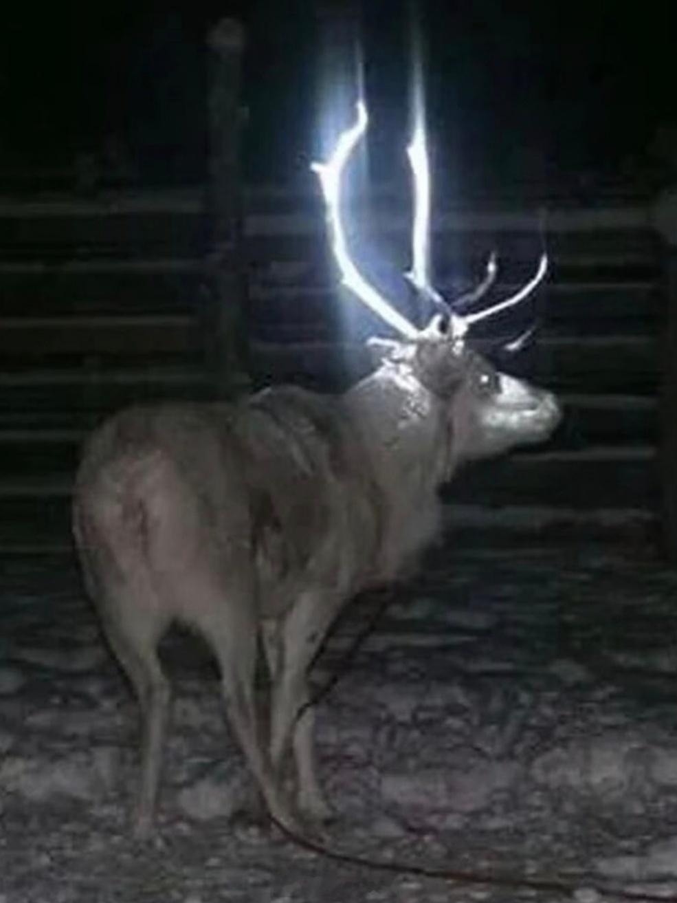 为了防止驯鹿夜里被车撞,芬兰人给鹿角刷上反光涂料。乍一看还有点神兽的味道