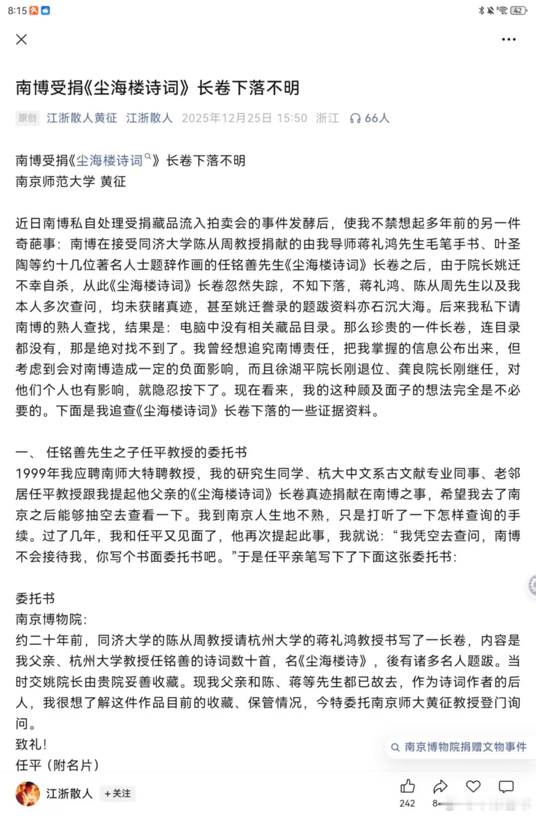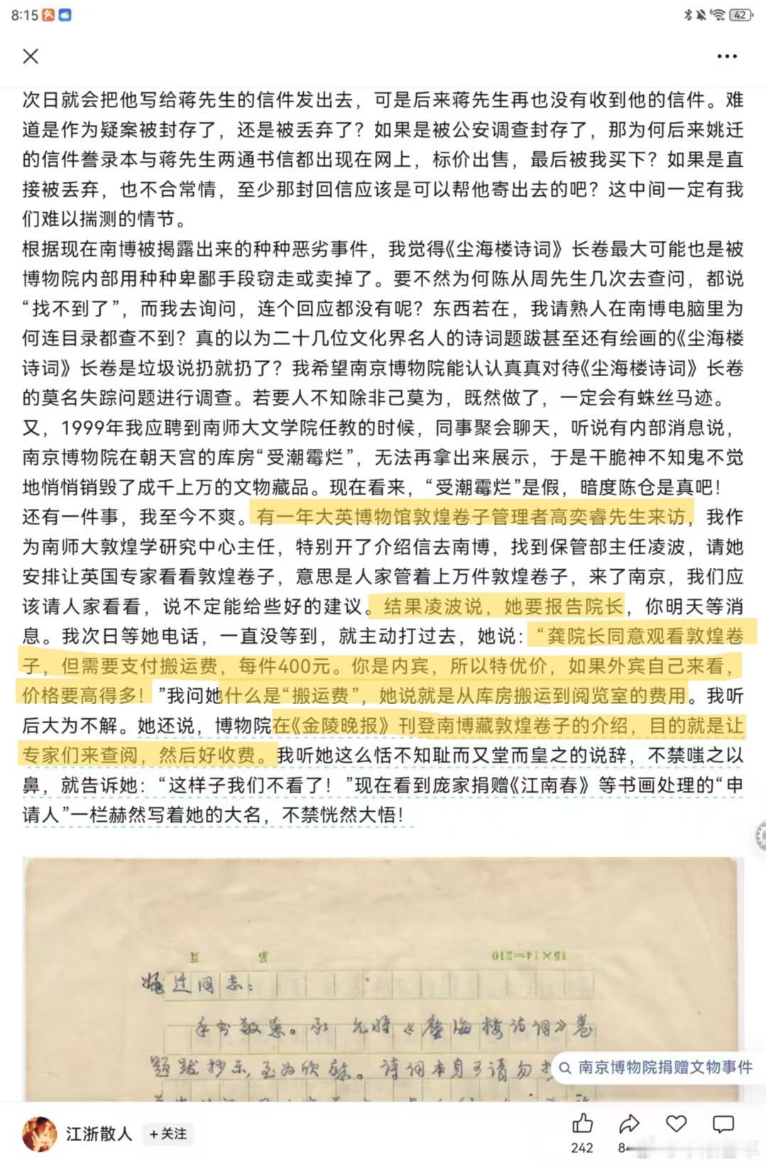 黄征老师这篇文章,有理有据,每个环节都还原了,有信件和时间线,应该不会错气的是后面这一块,查个敦煌遗书,还要搬运费,400元!报纸登载就为了让人来查询收费!学术的东西搞成这样,读书人的体面真是不要了。我看荣新江全世界找敦煌遗书,没听他说要收费,最多就是抢座位。施萍婷也是满世界查敦煌遗书,在他们的文章中都没有看到国外机构收费查询的事宜。搞学术嘛!龚良,看得文质彬彬,在央视《开讲了》大言不惭的,原来也是生财有道。在本次的南博事件的报道中——“对于“南博事件”相关事宜,南京博物院名誉院长龚良表示,“这个事情,我没什么可说的,抱歉。””徐湖平,龚良……这上梁不正,下梁好不到哪儿去 江苏省委省政府对南博开展全面调查网页链接