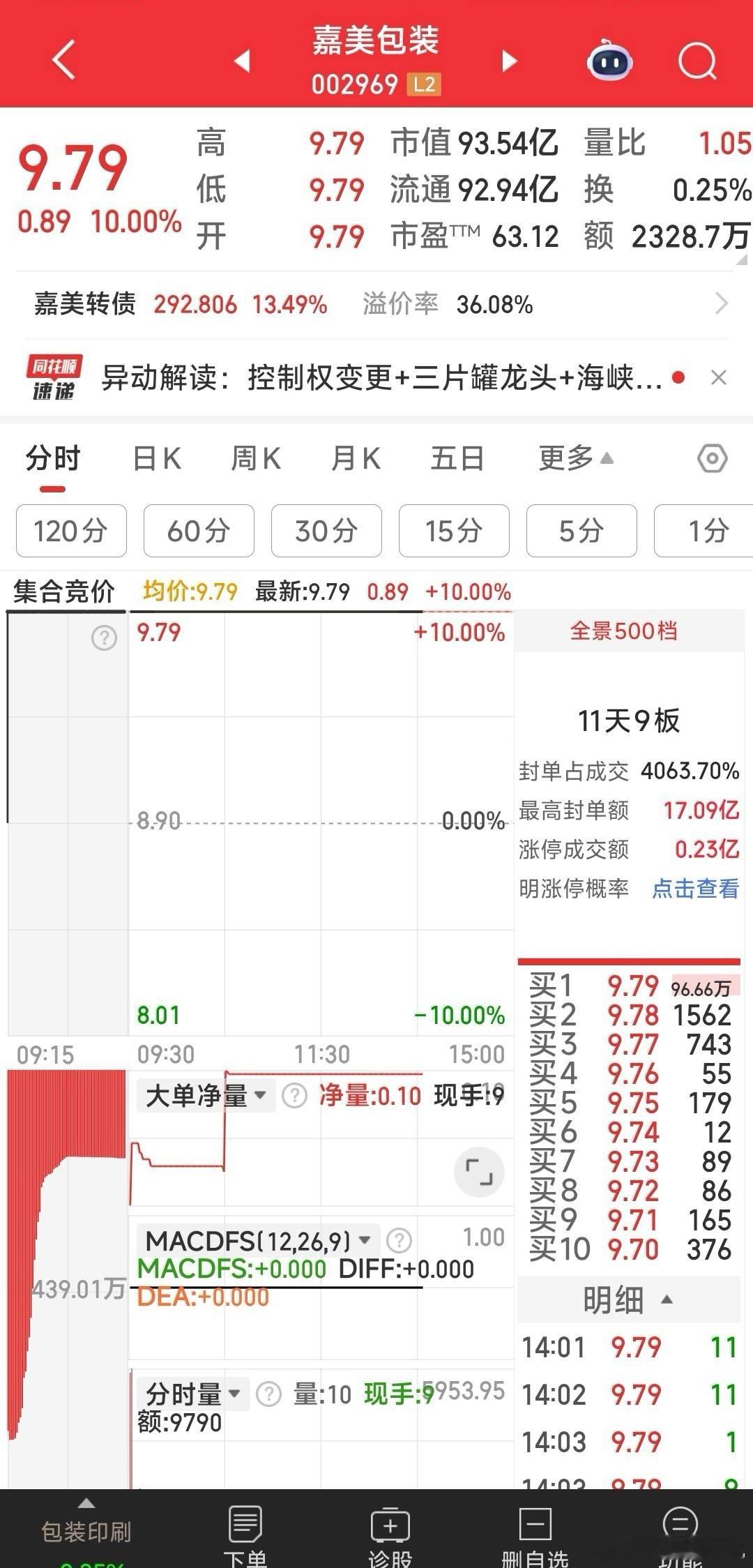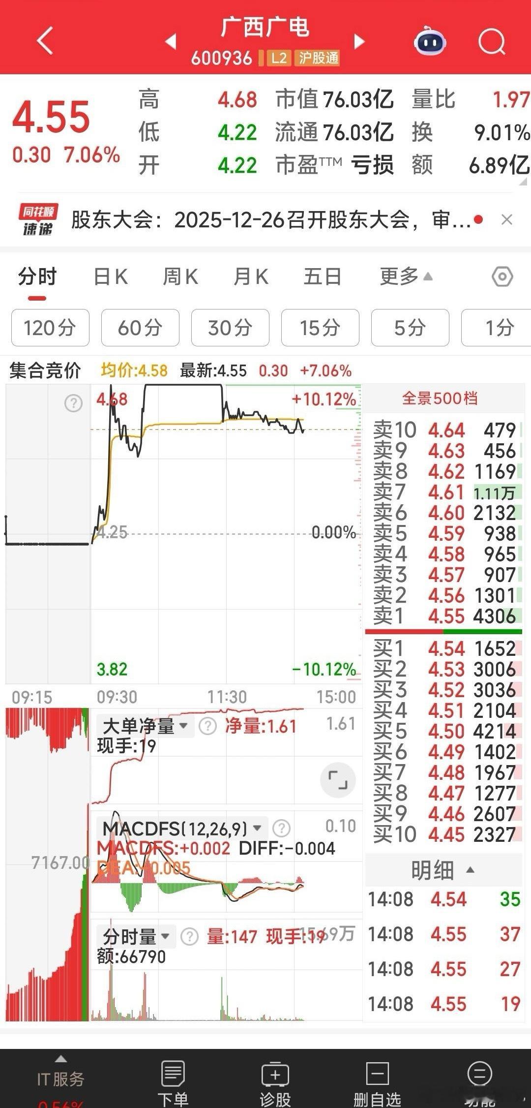 【再操作一把,加仓到广西广电】估计嘉美包装今天己不会上车了,故撤单。资金4.55元再加仓广西广电,有可能尾盘依然回封涨停。至少下周改名北投科技后,应有溢价收获。
