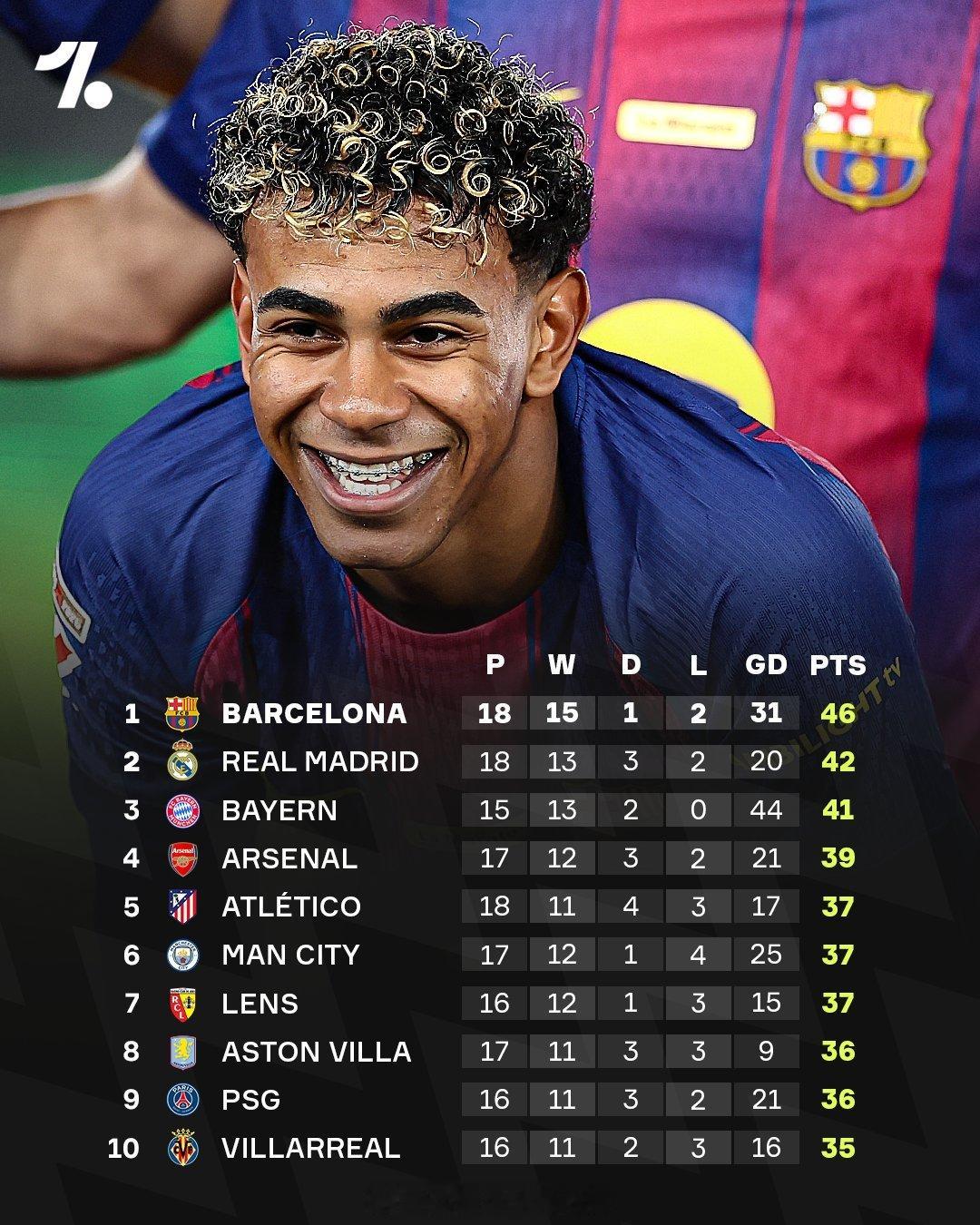 【皇萨仁前三!五大联赛积分榜排行榜】将欧洲五大联赛所有球队,按照联赛积分进行榜名,列出一个混合排行榜,前10名球队如下,巴萨、皇马、拜仁位居前三!PS:尽管各大联赛,各支球队的比赛场次不一样,但是在三分制下依然可以这样来排名。
