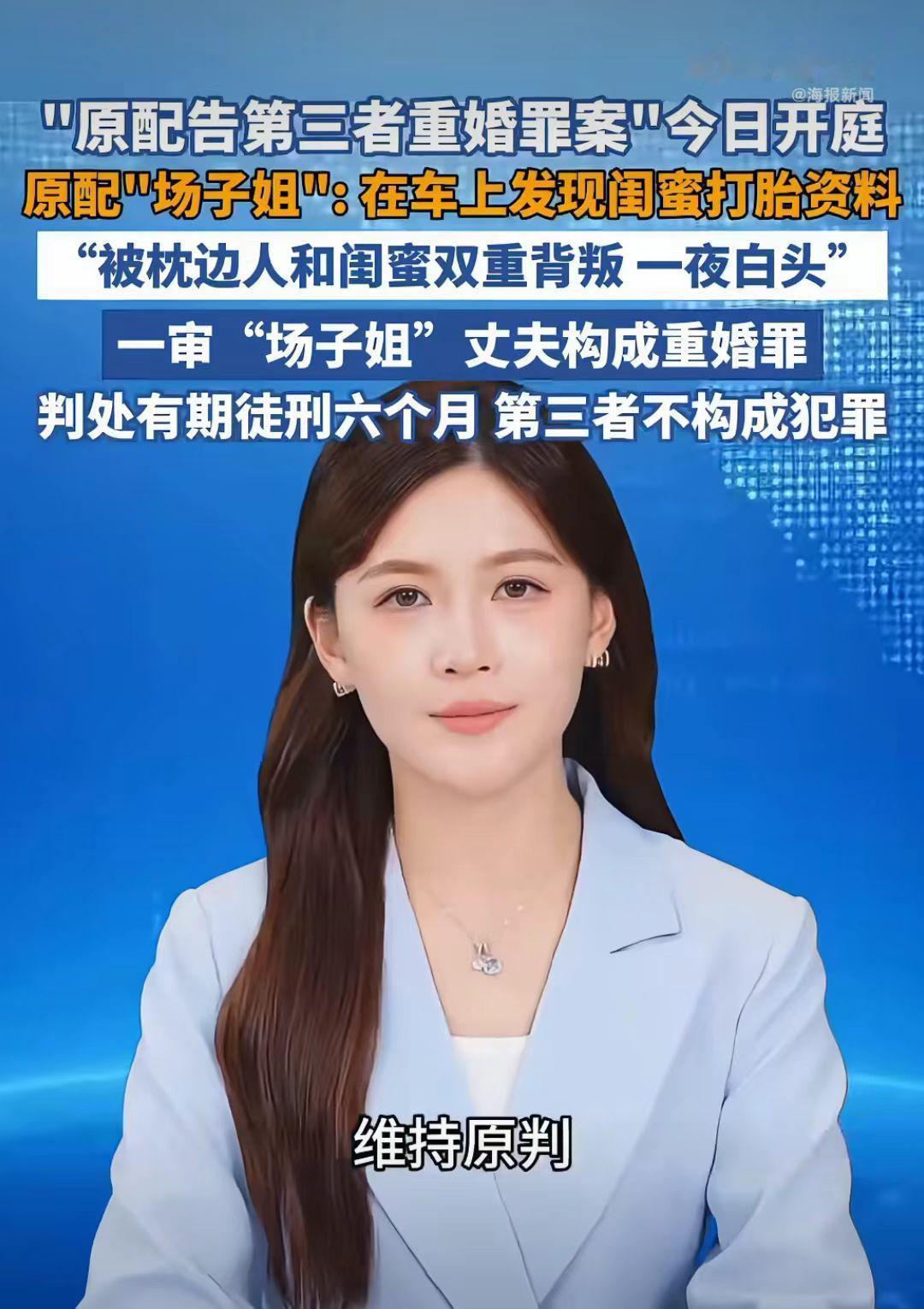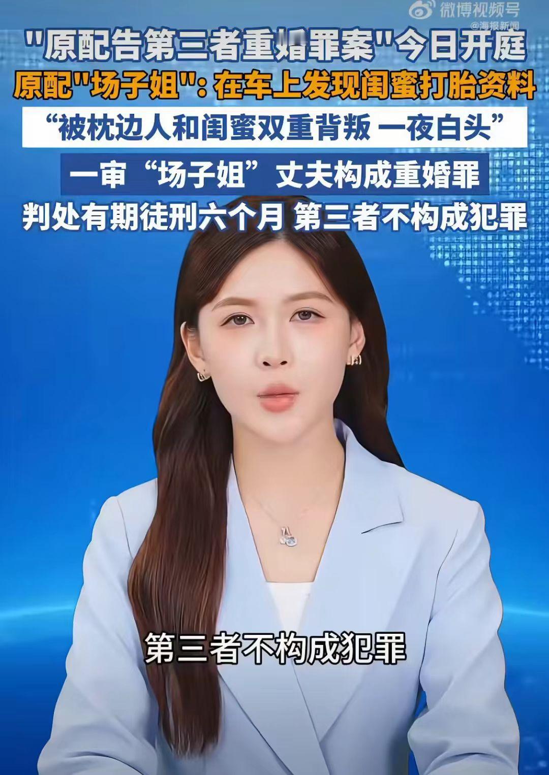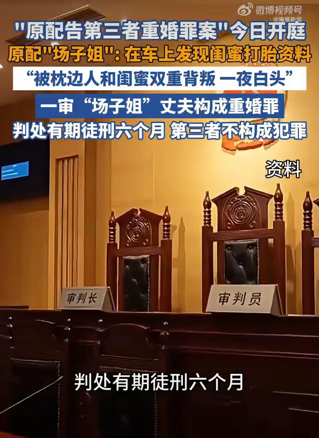 原配告第三者重婚罪开庭了, 一审“场子姐”丈夫判有期徒刑6个月,第三者不构成犯罪, 二审法院驳回了“场子姐”的上诉。 事情经过:陕西场子姐和丈夫结婚20年,共同经营多家企业,2021年,场子姐在丈夫车子里发现好闺蜜潘某的打胎记录,明显的丈夫和闺蜜双重背叛啊! 场子姐在丈夫车子里发现好闺蜜潘某的打胎记录时,瞬间感觉天都塌了。 场子姐为了自己家庭孩子,就决定找闺蜜谈谈,说你能不能不要破坏我的家庭,让孩子有个完整的家。 好闺蜜直接把她拉黑了,不理她了。 场子姐把丈夫出轨的事告诉公公婆婆了,公公婆婆也劝儿子收收心,不要把家给毁了。 可是场子姐的丈夫是吃了秤砣死了心,不听劝,还和潘某夫妻相称,还让儿子叫潘某“妈妈”。 真是杀人诛心啊!这是一个丈夫能干的事吗?竟然让孩子叫潘某“妈妈”。 场子姐遭丈夫闺蜜出轨,儿子的那一声潘某:“妈妈”,身心受创,一夜白头。 2023年,场子姐决定向法院起诉丈夫和小三潘某。 2023年,一审法院认定场子姐的丈夫构成重婚罪,判处了有期徒刑六年,第三者潘某不构成犯罪。 在法庭上,第三者说自己和场子姐的丈夫只是谈恋爱,没有叫他丈夫。 这是吃透法律了,没有证据证明自己和他是夫妻,就不犯法了吗? 场子姐不服,再次向法院提出申诉。 2025年,二审判决: 法院维持原判,场子姐找了5位证人(包括潘某公司员工)证明其公开以配偶自居,却未能改变判决结果。 难道对破坏婚姻的第三没有惩罚了吗? 你能接受这个判决结果吗? 婚姻家庭小三 小三 婚姻小三插足