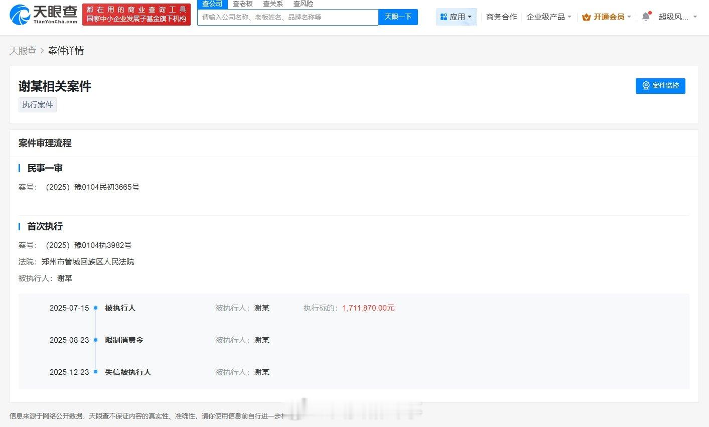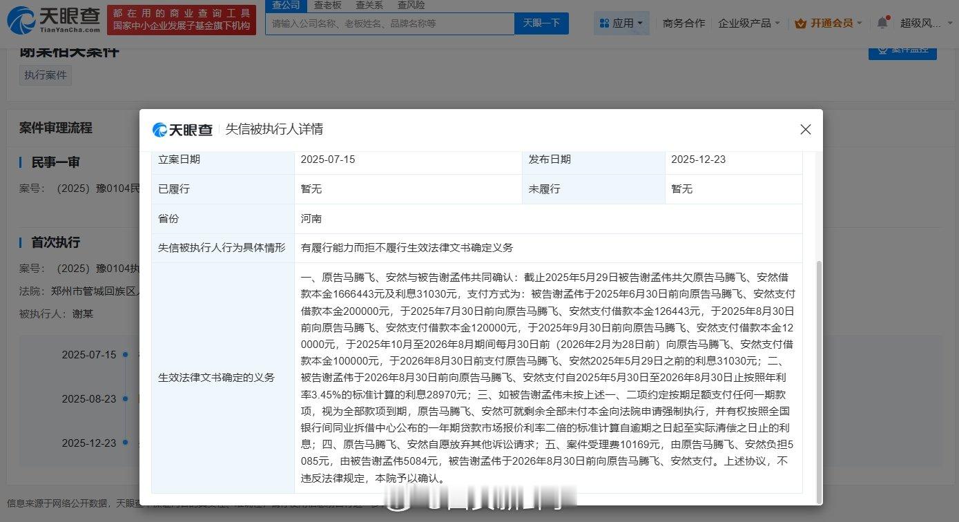 【嘎子哥成老赖】嘎子哥未履行169万案款成老赖天眼查天眼风险信息显示,近日,谢孟伟(嘎子哥)因有履行能力而拒不履行生效法律文书确定义务,被郑州市管城回族区人民法院列为失信被执行人(老赖),履行情况为全部未履行。文书显示,两原告与被告谢孟伟共同确认:截至2025年5月29日,谢孟伟共欠原告借款本金166.6万、利息3.1万余元,支付方式为谢孟伟分批支付借款本金及利息。如谢孟伟未按约定按期足额支付任何一期款项,则原告可就剩余全部未付本金向法院申请强制执行。案件流程信息显示,此前,谢孟伟曾因此案被执行171万余元,并被限制高消费。