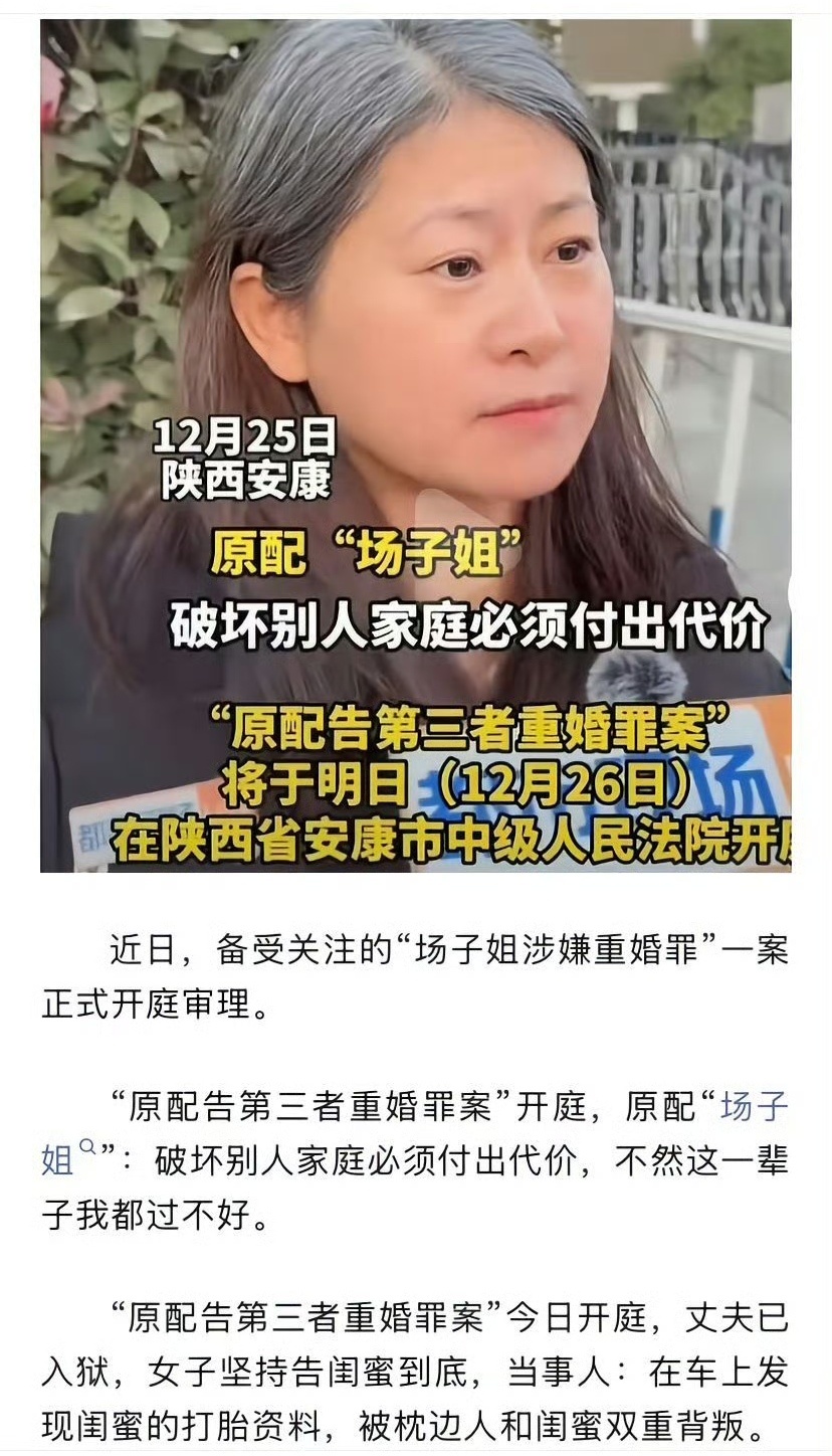 12月26日,陕西安康“原配告第三者重婚罪”再审开庭,原告为网红“场子姐”,被告是其昔日闺蜜潘某彤。从案件经过看,场子姐发现丈夫与潘某彤以夫妻名义共同生活,并曾在她车内留下2021年8月的堕胎记录。2023年,法院曾已以重婚罪判处其丈夫有期徒刑6个月,但认为证据不足以认定潘某彤构成犯罪,驳回针对潘某的起诉。原配场子姐希望小三也受制裁老公被判6个月闺蜜无罪原配上诉对于一审判决,场子姐表示不服,随后持续收集新的证据,如两人对外以“老公老婆”相称的录音、租房信息等,更让13岁儿子出庭作证,要求追究昔日闺蜜潘某彤的重婚刑责。场子姐与丈夫胡某某结婚20余年,并育有一子,在两人婚姻存续期间,场子姐在短视频平台走红,而闺蜜潘某彤此前经营多家瑜伽馆,从2021年6月起由场子姐帮忙做短视频推广。另一条时间线是,潘某彤曾于2021年8月在胡某某陪同下堕胎,二人婚外情随后因堕胎记录被场子姐知晓,可见二人的婚外情关系持续时间很久。根据我国当前相关法律规定,重婚罪的认定,核心在于是否“有配偶而又与他人结婚”,除了“领证”形式的重婚,还有现实常见的事实重婚,除了婚外同居、生育子女外,更要看是否对外公布,外界是否普遍认为是夫妻,仅有“同居”“堕胎”但未公开宣称夫妻,目前很难被认定为重婚。原配场子姐希望小三也受制裁