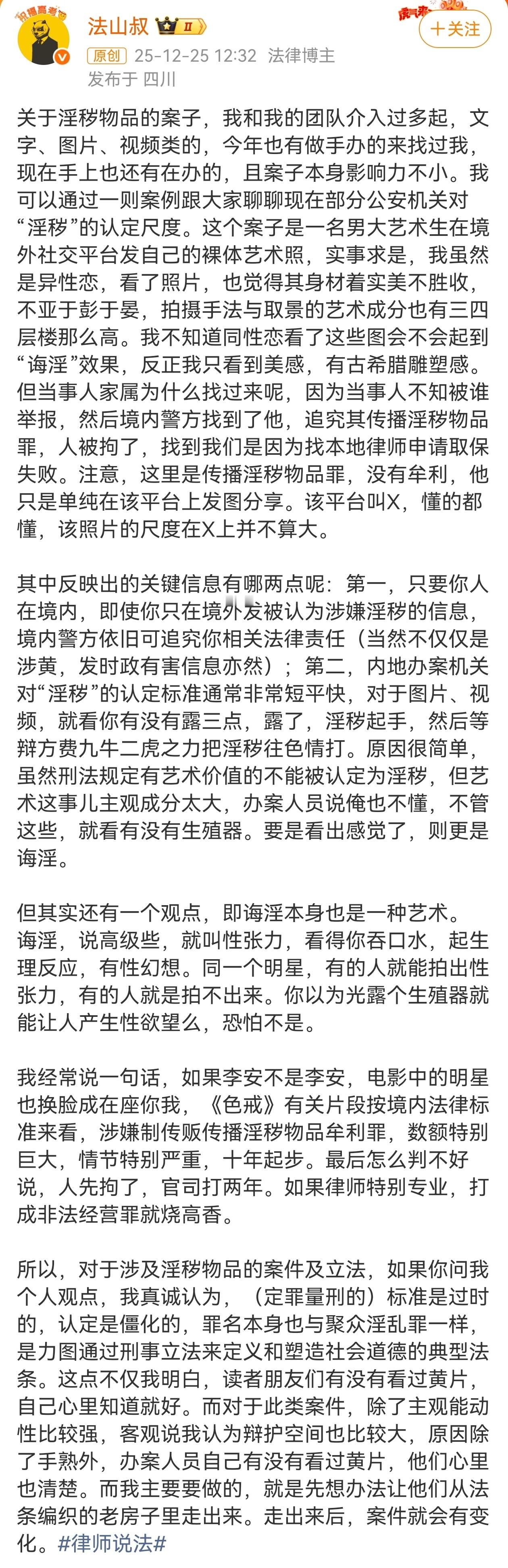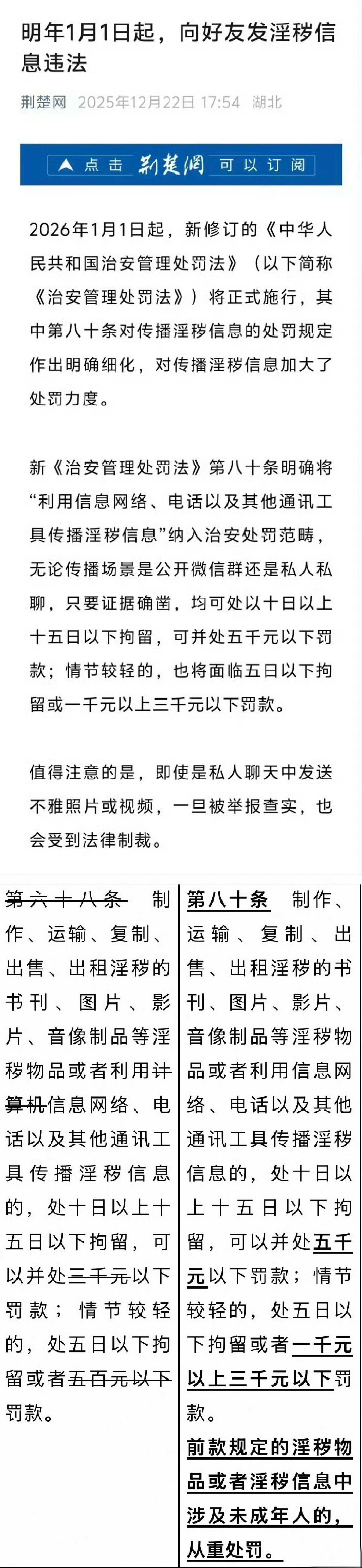 在我看来,针对淫秽内容的判定,不能是个人主观看了“有感觉”,定罪量刑的相关标准应该与时俱进。同样,情侣、夫妻、好友之间发送不雅照片、视频,是否涉嫌违法,不能成为“口袋罪”,违法与否取决于接收方是否举报,得看双方的具体关系,相关内容“交流”在当时是否是彼此自愿的,否则会成为情侣分手后的“报复手段”。淫秽的认定尺度科普满谈2026年1月1日日,新修订的《治安管理处罚法》将正式实施,广大网友没必要“谈法色变”,普通私房照、亲密视频、表情包,只要没有达到“诲淫性”程度,就不在打击范围,更谈不上犯罪,至于“淫秽内容”的判定,目前还存在一定主观性,这是阶段性的法律模糊区域。需要强调的是,新法把“计算机信息网络”改成“信息网络”,只是技术表述更新,并未新增“情侣互发即违法”的具体条款。续,我们需要警惕的是,情侣分手、夫妻离婚、好友闹掰后,是否会有此前私发的不雅内容举报、报复?在我看来,双方保留相关聊天记录、证明当时系自愿接收,才是最好的护身符。淫秽的认定尺度