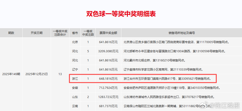 #台州幸运儿收获648万大奖#【648万!台州幸运儿收获双色球大奖】648万元的双色球大奖,出在台州玉环!12月25日晚,双色球第2025149期开奖。全国共中出单注奖金641.8万元的一等奖13注,分别出自:北京(1注)河北(6注)辽宁(1注)浙江(1注)安徽(1注)山东(2注)云南(1注)。浙江这注一等奖,中奖彩票售出于台州市玉环县楚门镇。因是复式投注,单票总奖金648.1816万元。除了这注一等奖外,浙江购彩者还收获二等奖6注(杭州、温州各2注;宁波、台州各1注)。(潮新闻 实习生 宋雨萱)