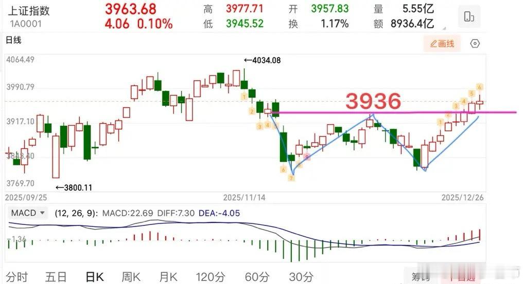 2025.12.26周五收评: 八连阳,大盘即将练成九阳神功! 周五大盘还是上演了惊心动魄的一幕,盘中突发跳水,速度非常快,但下午又拉回来了,显然空头的力量没有得到延续,但其实这个跳水是有预期的,突破3936颈线,都会有个回踩确认的动作,所以以后遇到这种情况,先不要慌,首先要看结构是否正常,比如盘中跳水并未跌破3936,第二,空头是否具备持续性的问题。 今天收了根十字星,显然从3815开始的向上走势,第一次出现了分歧,空头力量在逐步显现,那么就说明指数越往上就越要注意多头力量以及4000点附近的压力。 技术面看,既然有分歧,短线大概率会有个做震荡中枢的过程,消化获利筹码,这里的关键就是3936,不破3936颈线则反弹还会延续。如果跌破,那么就会震荡的时间长一些,但只要不破下方10/20日线,就不用担心,还可以当作是强势震荡,所以拉回还是寻求机会为主。 板块上,商业航天正鸭嘴3-5天行情还在延续,今天回踩顺势回补缺口,但走势正常,以5日线为跟踪即可,留意板块内部高低切。另外就是半导体、零售走势其实都是正常的,都可以留意相关回调的机会。 个人观点,仅供参考!