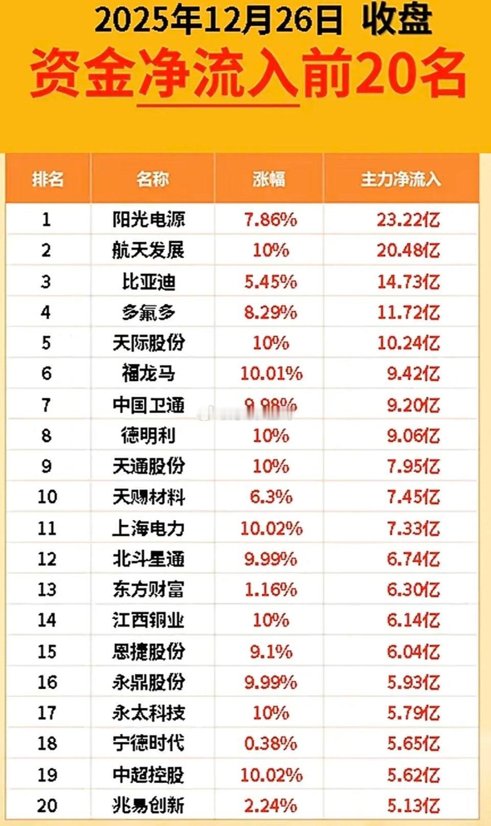 12月26日收盘资金净流入前20股梳理分析!今日资金主力集中于新能源、军工、半导体、电力、有色金属等赛道;超七成个股涨幅达9%以上(含涨停),阳光电源主力净流入以23.22亿居首,宁德时代虽涨幅仅0.38%,仍跻身净流入榜单,反映资金既追捧高景气赛道涨停股,也布局行业核心龙头。个股梳理分析1. 阳光电源:主力净流入23.22亿居首,涨幅7.86%,作为光伏逆变器龙头,未涨停却获资金重点布局,体现市场对光伏赛道的看好,是新能源板块核心标的之一。2. 航天发展:涨停(10%),主力净流入20.48亿排第二,属军工板块,资金追捧或因军工政策利好/行业景气度提升,成为军工板块资金龙头。3. 比亚迪:涨幅5.45%,主力净流入14.73亿,新能源汽车龙头,虽涨幅不及涨停股,却凭行业地位获资金持续关注,反映新能源车赛道的长期吸引力。4. 多氟多:涨幅8.29%,主力净流入11.72亿,主营氟化工与锂电池材料,资金流入关联新能源材料需求增长,其电解液上游布局获资金认可。5. 天际股份:涨停(10%),主力净流入10.24亿,涉及锂电池电解液添加剂业务,是新能源材料细分标的,资金追捧推动涨停,凸显细分领域热度。6. 福龙马:涨幅10.01%近乎涨停,主力净流入9.42亿,主营环卫装备及服务,资金流入与环保、新能源环卫车发展预期相关,成环保板块资金焦点。7. 中国卫通:涨幅9.98%近乎涨停,主力净流入9.20亿,为卫星通信核心标的,低轨卫星、卫星互联网发展预期推动资金涌入,是通信航天热门股。8. 德明利:涨停(10%),主力净流入9.06亿,主营存储芯片相关业务,属半导体存储细分标的,资金追捧助力涨停,反映半导体板块局部热度。9. 天通股份:涨停(10%),主力净流入7.95亿,涉磁性材料、半导体设备领域,多元化布局契合高端制造方向,资金流入推动涨停获市场认可。10. 天赐材料:涨幅6.3%,主力净流入7.45亿,是锂电池电解液龙头,虽涨幅未达涨停,仍获主力持续布局,体现新能源电池材料赛道的价值。11. 上海电力:涨幅10.02%涨停,主力净流入7.33亿,属电力板块,绿电、新能源发电发展预期推动资金流入,是电力板块资金龙头之一。12. 北斗星通:涨幅9.99%近乎涨停,主力净流入6.74亿,为北斗导航核心标的,卫星导航产业发展与应用落地预期,吸引资金追捧成军工通信热门股。13. 东方财富:涨幅1.16%,主力净流入6.30亿,是证券互联网金融龙头,虽涨幅低迷,资金流入或源于金融板块配置需求,体现权重标的配置价值。14. 江西铜业:涨停(10%),主力净流入6.14亿,为有色金属龙头,铜价走势与新能源铜需求增长推动资金涌入,成有色板块资金焦点。15. 恩捷股份:涨幅9.1%,主力净流入6.04亿,是锂电池隔膜龙头,新能源电池材料高景气下获资金关注,虽未涨停仍受主力青睐。16. 永鼎股份:涨幅9.99%近乎涨停,主力净流入5.93亿,涉光通信、超导领域,多元化科技赛道布局吸引资金,推动其接近涨停。17. 永太科技:涨停(10%),主力净流入5.79亿,主营氟化工及锂电材料,是新能源材料细分标的,资金追捧助力涨停,彰显细分领域机会。18. 宁德时代:涨幅0.38%,主力净流入5.65亿,为锂电池龙头,虽当日涨幅微弱,却凭绝对行业地位获主力布局,体现长期配置价值。19. 中超控股:涨幅10.02%涨停,主力净流入5.62亿,涉电线电缆、新能源线缆业务,属新能源配套标的,资金流入推动涨停获市场关注。20. 兆易创新:涨幅2.24%,主力净流入5.13亿,是半导体存储龙头,虽涨幅较低,半导体国产替代的长期逻辑仍吸引主力资金布局。