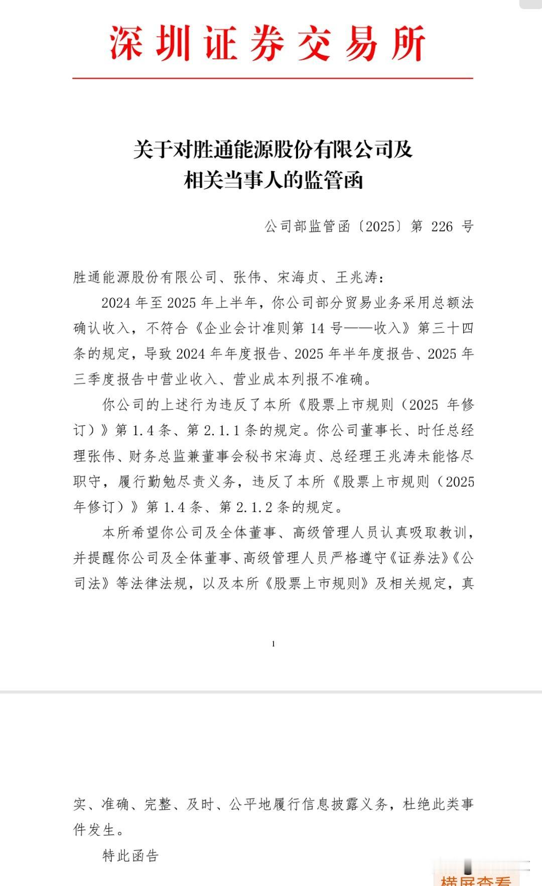 11个一字板的大牛股,没有关进小黑屋,却迎来了监管函 这是意料之外的惊喜 近期由于收购一家机器人公司而大涨的牛股,今晚原本预测会不会关小黑屋。小黑屋没来,但是它收到了监管函。这种警告意味非常明显了。 这事可大可小,据监管函称:它2024年报,2025年半年、三季报中营业收入,营业成本列报不准确。 它要是追究起来,至少是信息披露出了问题,更严重中,会不会认定2024年造假? 虽然现在是交易所的监管函,但是它后面会不会被立案?会不会ST?真不好说。 最近两天,它虽然还是非常强势,但是筹码已经松动,今天换手率达到了15.54%,机构资金在跑了。至于它后续走势,应该不会扑街。 这个短期看,警告意味非常明显了,但是就现在的市场状态,它彻底熄火的可能性也不大。对于我们散户而言,还是远离是非之地吧,一旦被套,那是相当难受得。
