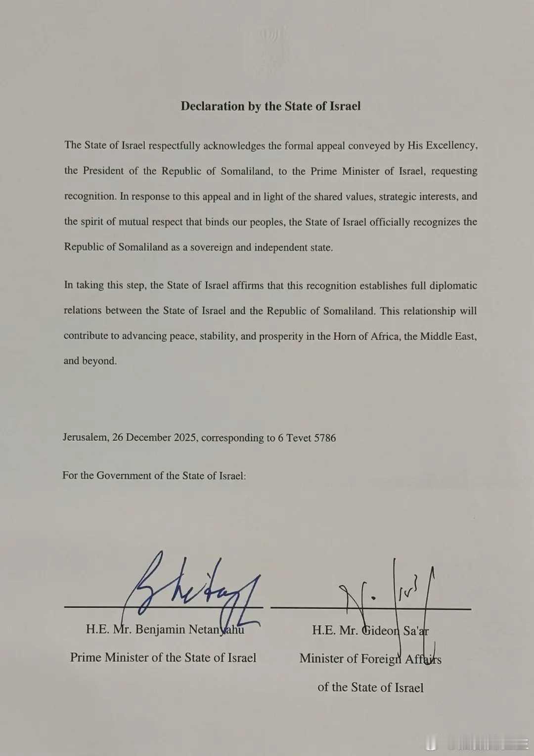海外新鲜事 2025年12月26日,以色列正式承认索马里兰共和国独立,成为联合国会员国中首个承认这一事实的国家。以色列总理本杰明·内塔尼亚胡签署了相互承认的联合声明,并邀请索马里兰总统阿卜迪拉赫曼·穆罕默德·阿卜杜拉对以色列进行正式访问。