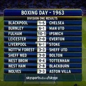 英超的节礼日因为种种原因,今年只有一场曼联vs纽卡的比赛在今晚进行。回顾英格兰顶级联赛的节礼日,最经典的一年莫过于1963年的进球盛宴。那一天的老英甲10场比赛狂轰66球,其中10-1和8-2这样的比分更是古今罕见。1963年节礼日大战:布莱克浦1-5切尔西伯恩利6-1曼联富勒姆10-1伊普斯维奇莱斯特城2-0埃弗顿利物浦6-1斯托克城诺丁汉森林3-3谢菲联谢周三3-0博尔顿西布朗4-4热刺西汉姆2-8布莱克本狼队3-3阿斯顿维拉补充:这一轮阿森纳4-1伯明翰的比赛不是在节礼日当天进行