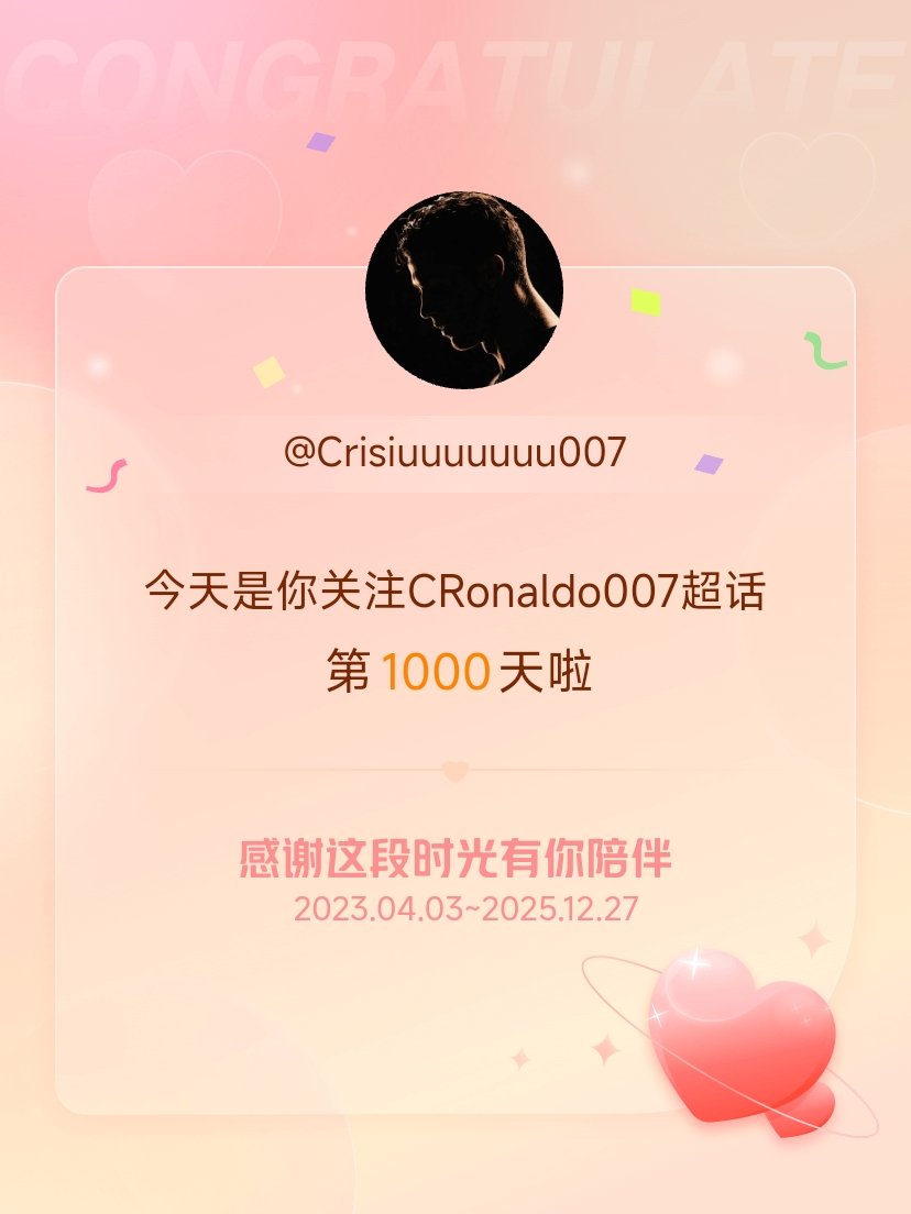 CRonaldo007今天是我关注超话的第1000天,希望能继续伴你一路前行~