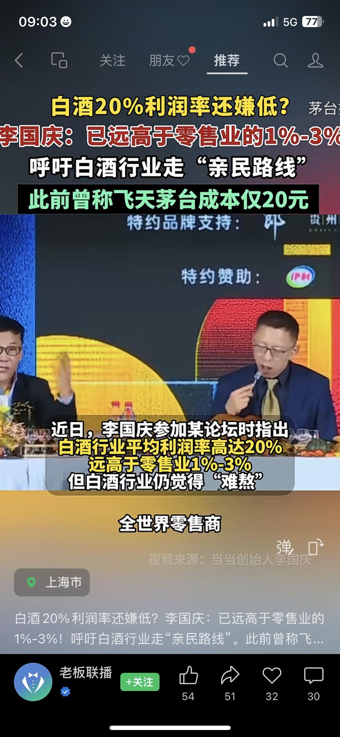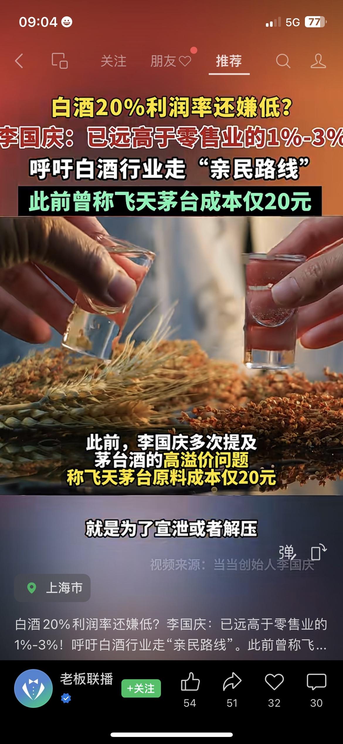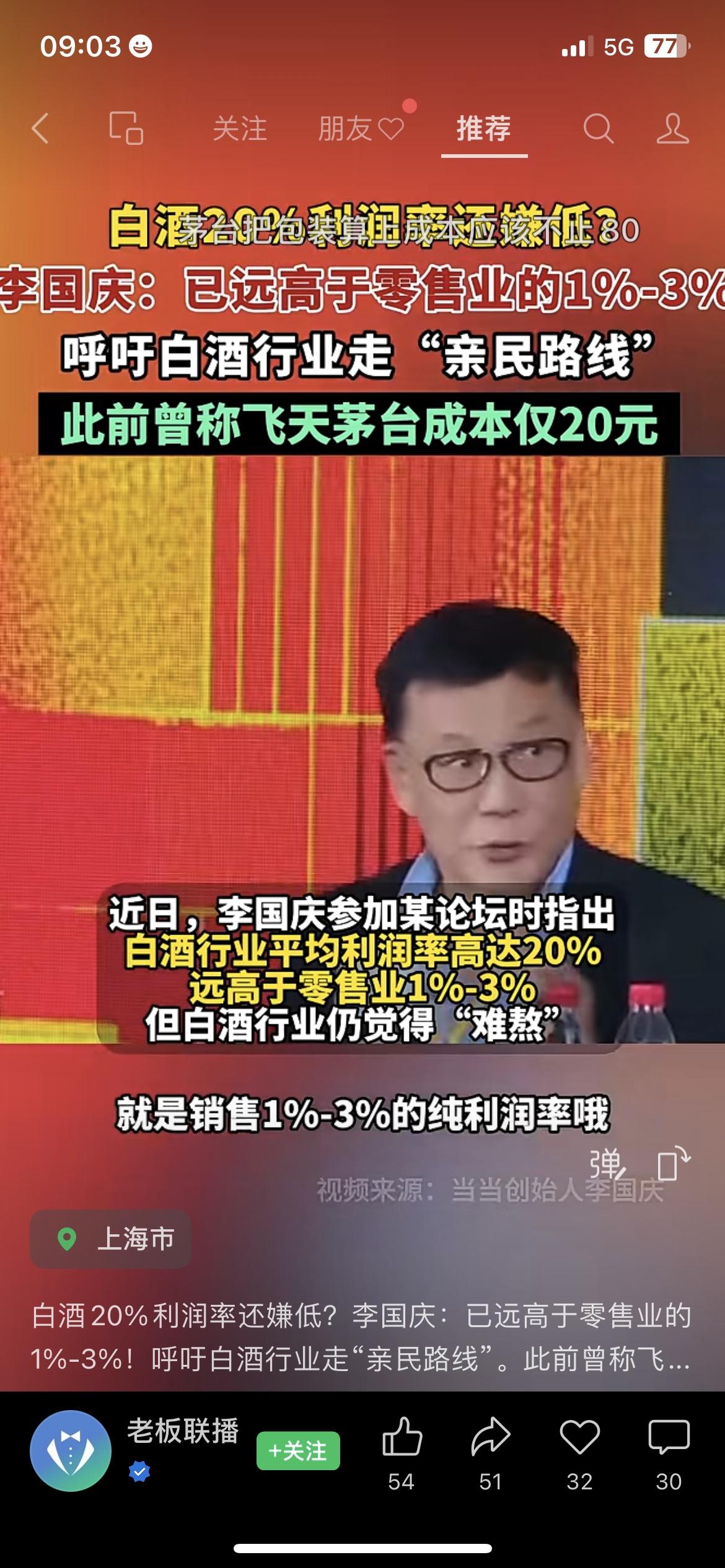 李国庆戳穿白酒行业真相!20%利润还喊难,茅台原料才20元白酒行业热议 中午和开烟酒店的表哥吃饭,他刚吐槽完白酒利润离谱,就刷到李国庆的发言。 白酒躺着赚20%利润还喊难,零售业才1%-3%,差距太扎心。 李国庆更直言,飞天茅台的原料成本仅20元,表哥当场翻出进货单。 指着上面香烟0.8%的利润率,气得拍桌子:凭啥白酒赚这么多,还总说难做? 小区门口烟酒店老板路过,凑过来看了眼,叹气说:盼着白酒能真亲民,别光搞溢价。 你觉得白酒行业该降利润走亲民路吗?茅台的定价,到底算不算合理? 白酒行业热议 李国庆谈白酒利润卖酒的真实现状 名酒市场利润