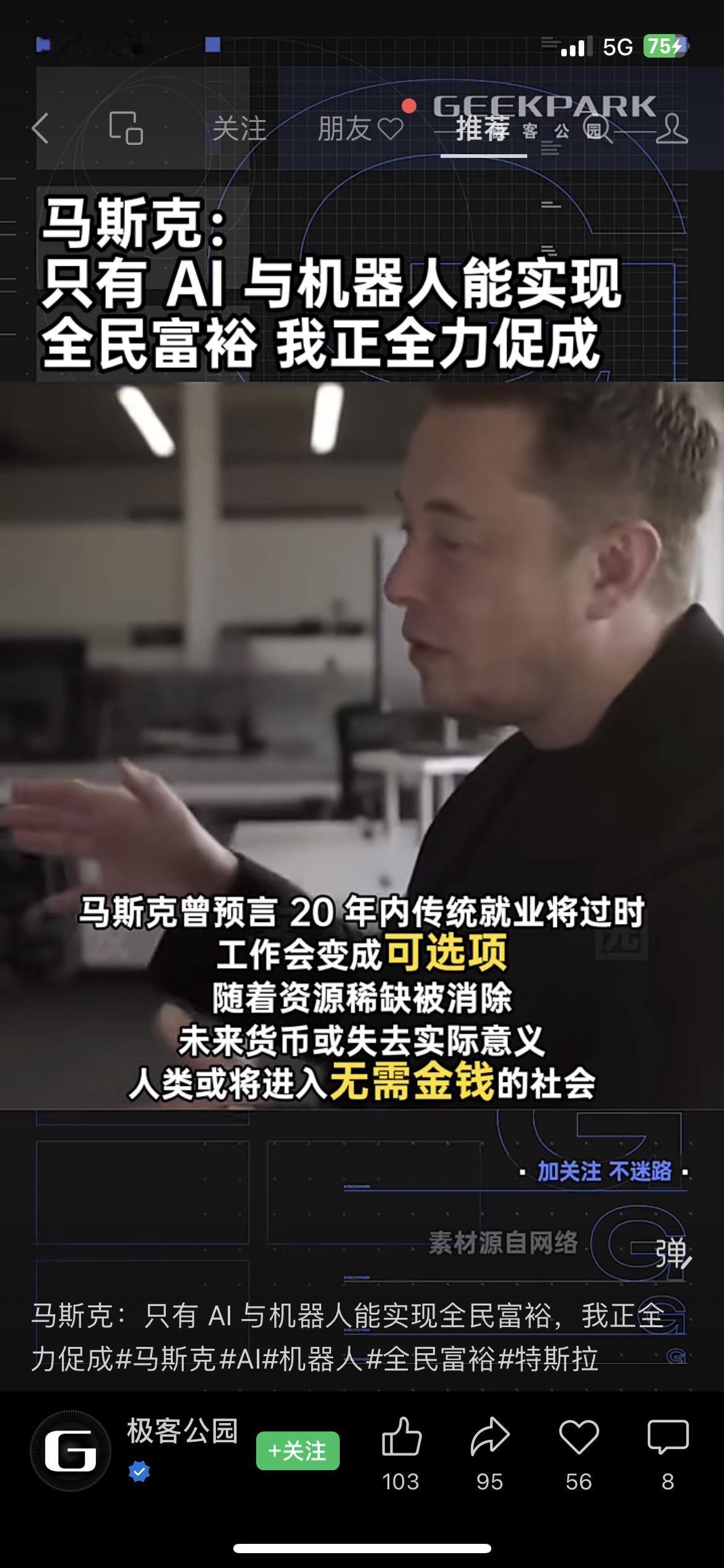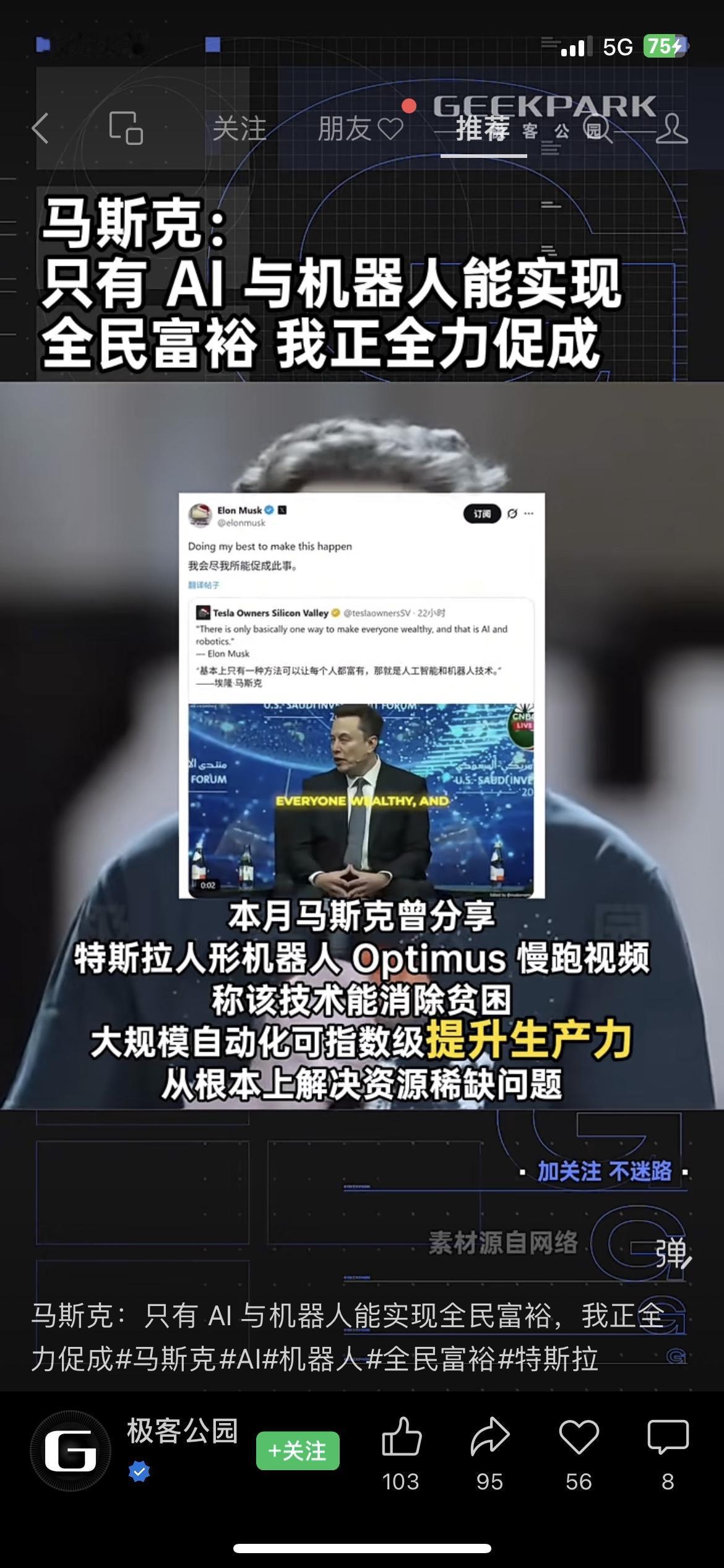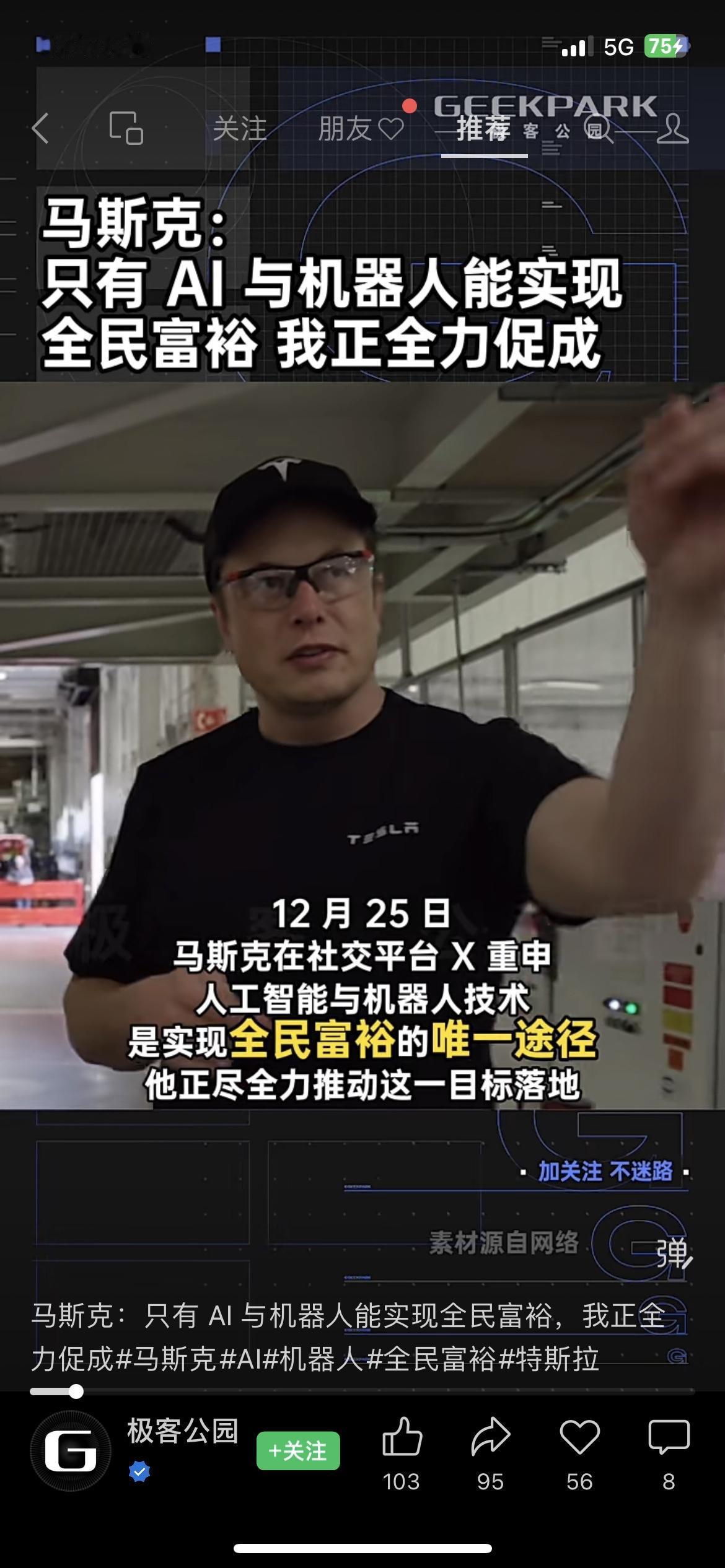 马斯克语出惊人!直言只有AI与机器人,才能实现全民富裕科技热点 AI前沿 马斯克最新发声引爆全网:想要实现全民富裕,唯一途径就是AI与机器人!这一观点瞬间引发热议,有人认同科技造富,也有人担忧就业危机。你觉得AI和机器人,真能让所有人都富起来吗?评论区聊聊看法!