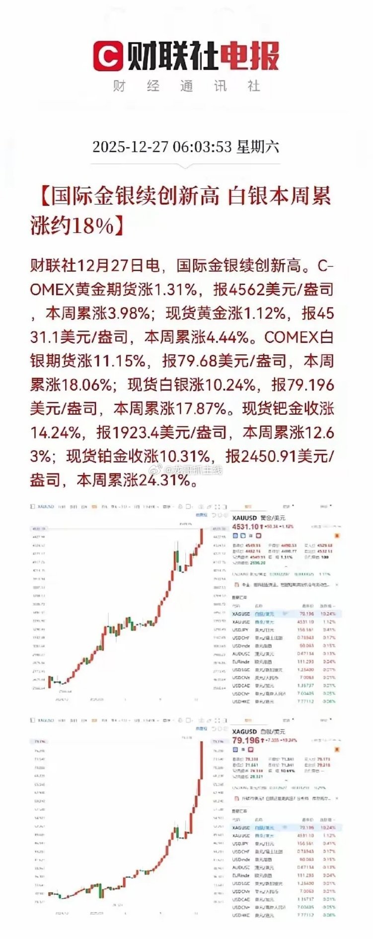 国际金银续创新高,白银本周累涨约18%!2025年12月27日财联社数据显示,国