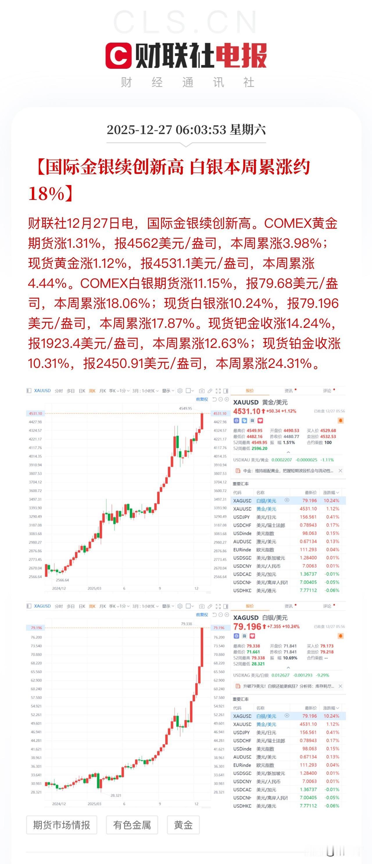 头皮发麻!白银单周涨幅18%! 想想白银、黄金市场平均30倍杠杆, 可以预见期货传奇故事素材已经摞到多厚。 像三千这种入门级别的选手, 哪怕看准了空方狙击点, 但若是行动上不果决, 不光捞不到一个子儿, 还要反手被多头打爆。 有色金属牛市变得越发波诡云谲了, 幸亏地产激流勇退, 不然现在金银铜铁一起逼空, 那攻势真会“银鞍照白马,飒踏如流星”, 华尔街这场资本大战指向明确, 相信东大是能顶住压力的。
