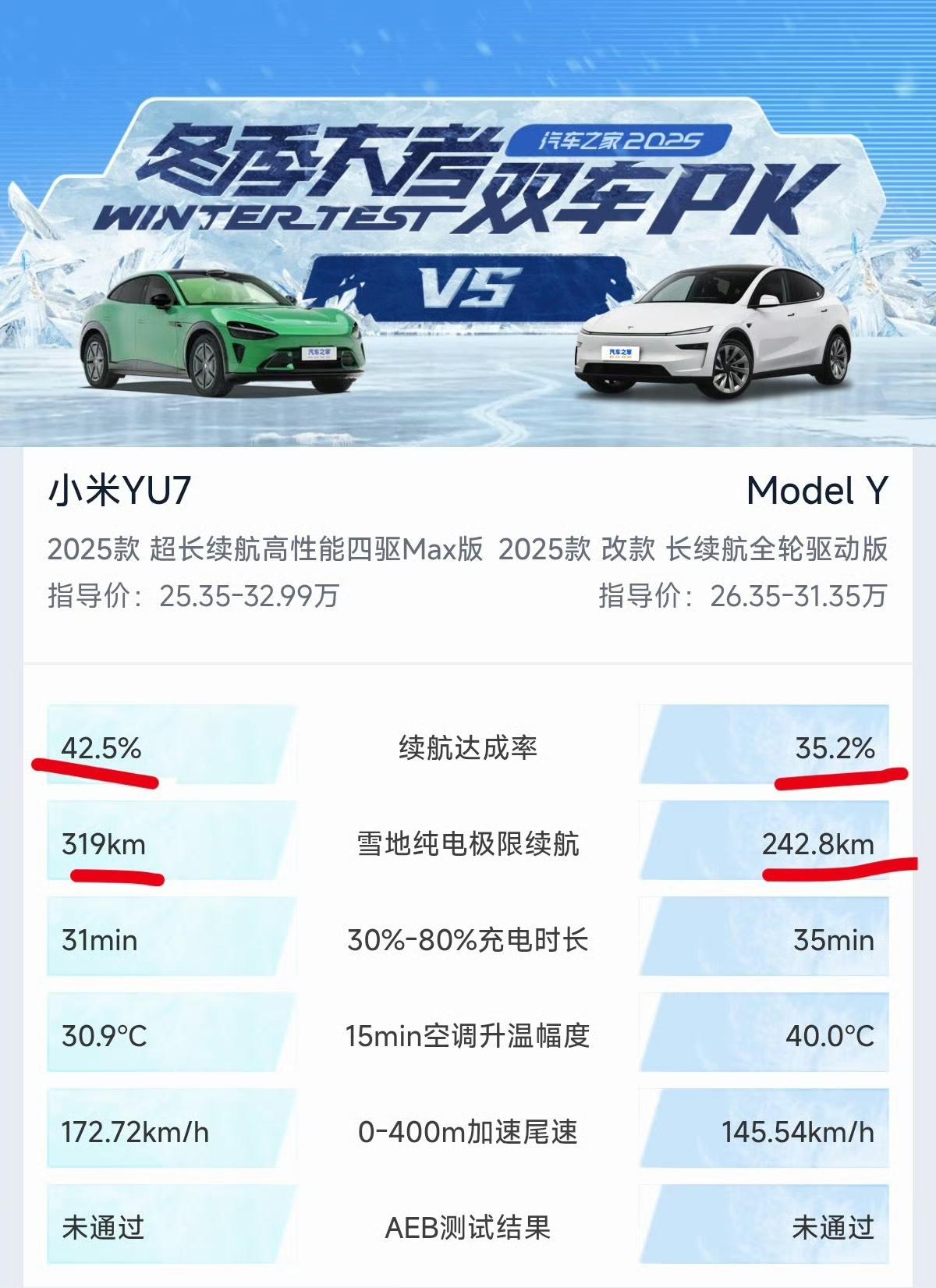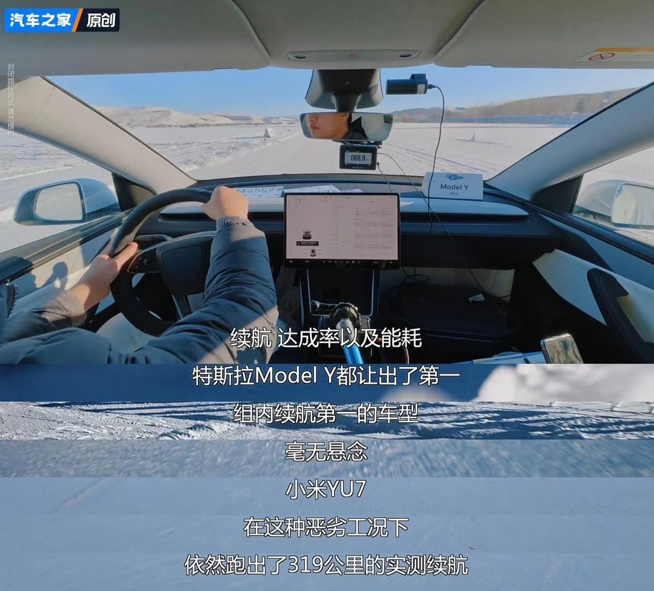 这下黑米慌了,小米YU7冬季实测五项第一,不是很多人各种贬低小米汽车没技术,汽车之家冬测成绩出炉小米就拿下5个第一。这下你们不能再说小米没技术了吧。 测试环境是零下20℃,小米YU7 以319km,达成率42.5%,平均电耗33.7kWh/100km,拿下冬测组内续航、能耗、充电效率第一,还远超行业标杆特斯拉Model Y的242.8km续航,35.2%续航达成率和34.9 kWh/100km电耗。 测试环境是零下20℃,充电速度测试,小米YU7(Max版)0-100%充电用时仅65分钟。再看特斯拉Model Y长续航全轮驱动版0-100%充满用时120分钟,小米快了55分钟。 测试环境是零下20℃,小米YU7冬测雪地零百加速6.57秒,全场第一,而且比很多轿车都快。 小米汽车真的很成功,在数据面前,这次黑米无从下手了吧。