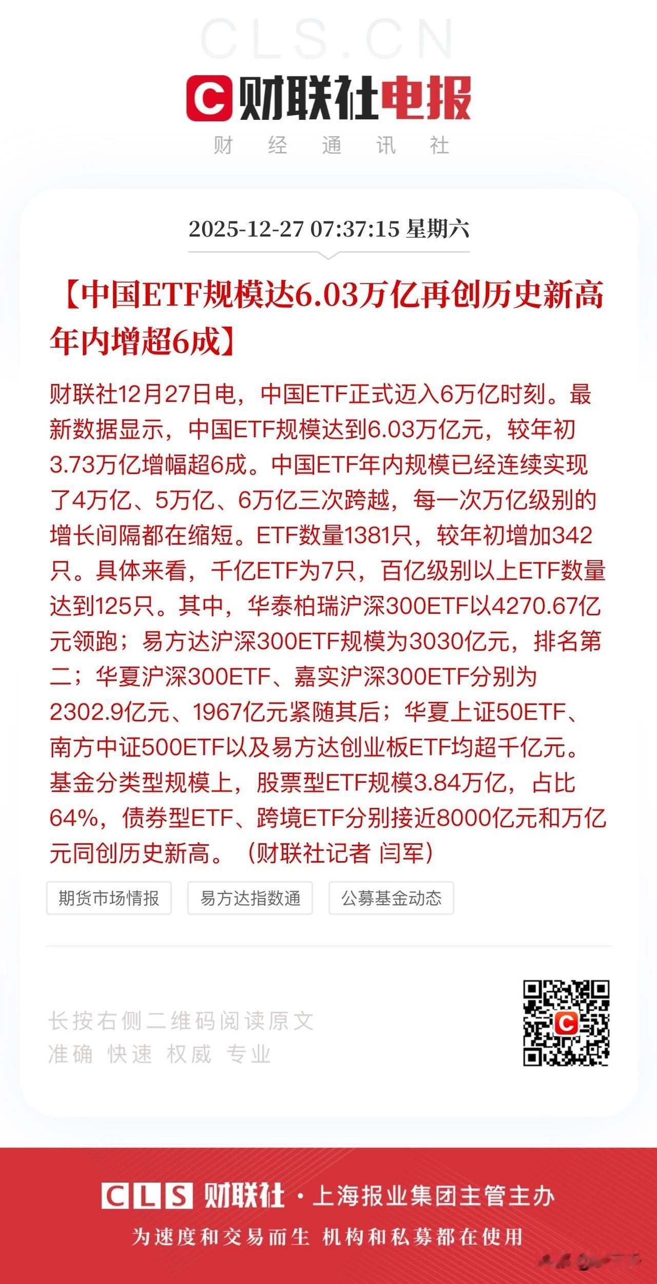 ETF规模不断突破! 本轮A股大牛市格局越发清晰。 三千大胆的预测本轮牛市顶峰时期, ETF日均成交量破万亿, 沪深两市单日成交量会破5万亿。 这也是为什么, 防守仓位上要坚定不移配置: 券商ETF、金融科技ETF, 只要完整的把那一大波吃到嘴里就够了。 在三大主线, 电池、科技、消费医药上均衡配置, 把握2026年牛市中后期可能的普涨行情。 2025年的科技牛已成过去, 吃到了那是满嘴流油,恭喜! 没吃到不要在高位去讲格局。 也许液冷、存储、PCB都还有机会, 但是从历史经验看大部分普通散修和韭派最后都是黯然离场…
