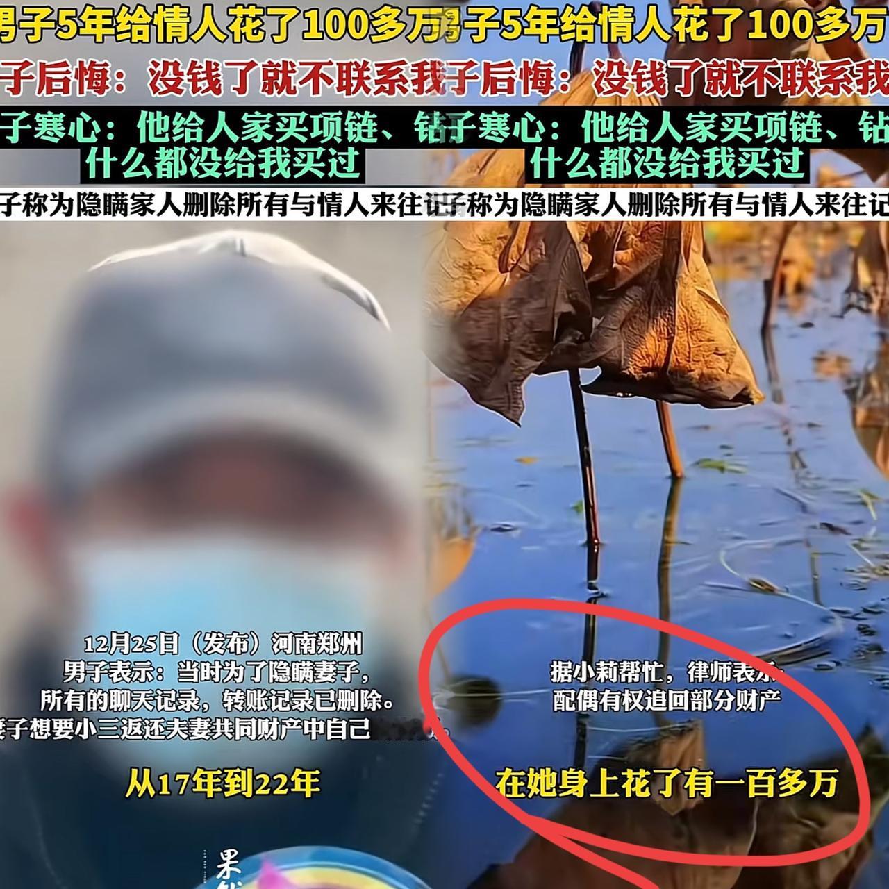 “男人只有挂到墙上才老实”这话虽狠, 可河南这五旬大叔真就应了这景! 大叔找小三五年,被美色迷得晕头转向,钻戒、转账、现金,前前后后给小三花了近百万。 结果钱花得差不多了,自己又生病,小三立马翻脸,删联系方式玩消失。 原配妻子知道后那叫一个心寒,32年没收到丈夫啥礼物,现在人财两空才想起自己。 妻子不甘心,毕竟那钱是夫妻共同财产,哪能便宜了小三。 大叔也后悔,当初怕妻子发现还删了聊天记录和转账记录。 这大叔和原配决定曝光小三,找记者帮忙讨回公道。 这事儿可给男人们提了个醒,美色诱惑虽大,但理智不能丢,不然最后落得个人财两空,后悔都来不及。 大家对这事儿咋看?快来评论区聊聊!