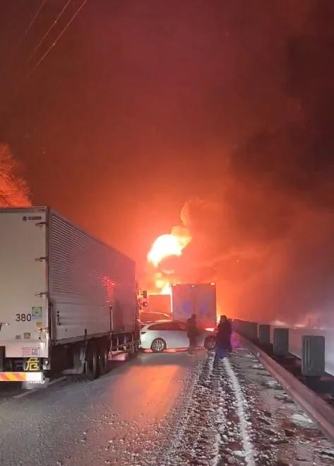 杰群上 县高速公路周五晚发生严重连环车祸,至少50辆车控追撞甚至有车辆起火燃烧。(X平台视频截图) (东京27日综合电)日本群马县高速公路周五晚发生严重连环车祸,至少50辆车失控追撞,甚至有车辆起火燃烧,造成至少1人死亡、26人受伤,其中5人伤势严重。警方初步研判,因正值暴雪车辆疑似打滑失控酿祸,也因路面结冰,让救灾难度提升。 综合ETToday新闻云等媒体报道,事故发生在当地时间晚上7点30分,当时群马县水上町附近的关越高速公路发生多车追撞,引发火烧车。 根据日媒披露画面,现场一辆疑似运送汽车的拖板车陷入燃烧,上面还载有多辆汽车,