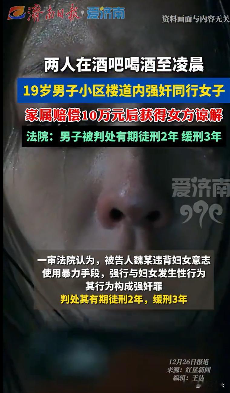 吉林白河林,一19岁男子与女子在酒吧喝酒至凌晨三点,散场后,男子坚持送女子回家,两人一前一后走进昏暗的楼道。不料,就在二楼转角,男子突然将女子推向墙壁,女子惊慌失措,哭着挣扎,身体不停扭动试图摆脱,但被男子牢牢按住,强行发生了关 系。得逞后,男子匆匆离去。女子瘫坐在楼梯上,颤抖着拨通了报警电话。事后,警方将男子逮捕归案,期间,男子家人筹措了十万元赔偿,女子选择了出具谅解书。法院这样判决。 2025年6月9日,对于刚满19岁的魏某和女子袁某而言,这个夜晚最终成了一道人生的分水岭。 这晚,魏某与袁某在一家酒吧相遇,推杯换盏之间,时间悄然流逝至凌晨三点,两人都有些许醉意,袁某打算回家。 魏某提出送袁某回家,袁某同意了,两人一同乘坐出租车,抵达了袁某居住的小区。 然而,当从出租车踏入寂静无人的小区院落,走向那栋居民楼时,魏某心中萌生了邪恶的念头。 魏某跟着袁某走入楼道,看着楼道内灯光昏暗,理智没有压制住欲望,当即将袁某按住,意图强行与之发生 关 系。 袁某防不胜防,但此刻醉酒,力量又悬殊,压根敌不过魏某的身体,只好选择哭泣、挣扎身体来反抗。 期间,袁某试图通过左右摇晃身体来阻止侵害的发生,但是,魏某最终利用其体力上的优势,压制了袁某的反抗,实施了侵害行为。 罪行完成后,魏某离开了现场,独自留下的袁某。 袁某没有选择隐忍,在惊恐与痛苦中,做出了一个勇敢而正确的决定,立即用电话报警,第一时间指控魏某的违法行为。 公安机关接到报警后迅速介入,并第一时间传唤了魏某,而魏某接到电话后,选择了前往公安机关。 到案后,魏某如实向办案人员供述了自己侵 害袁某的犯罪事实。 案件侦查终结后,公安机关将本案移送检察院审查起诉,检察院审查后认为,魏某的行为构成犯罪,遂提起公诉。 法院会如何判决呢? 《刑法》第二百三十六条规定,以暴力、胁迫或者其他手段强 奸妇女的,处三年以上十年以下有期徒刑。 法院指出,所谓强 J 罪是指“以暴力、胁迫或者其他手段,违背妇女意志,强行与妇女发生 关 系的行为”。 在案发过程中,被害人袁某面对魏某的侵 害行为,表现为“不停哭泣、反抗并通过左右摇晃身体阻止”,这些举动是其内心真实意愿的客观、直接外化,表明了拒绝态度。尽管反抗最终未能成功,但其持续存在,足以清晰地证明性行为的发生完全违背了袁某的主观意愿。 魏某在侦查阶段及法庭上的供述,亦承认其知晓袁某不愿配合,现有证据足以排除合理怀疑,认定魏某的行为完全违背了袁某的意志。 法院特别查明了因力量相差悬殊,魏某对袁某实施了侵害这一事实,证实魏某利用了其在体力上相对于袁某的绝对优势,压制并克服了袁某的身体反抗,从而强行达成侵 害目的。 法院认为,魏某的行为构成了强 J 罪。 不过,《刑法》第六十七条第一款规定,犯罪以后自动投案,如实供述自己的罪行的,是自首。对于自首的犯罪分子,可以从轻或者减轻处罚。 法院进一步指出,魏某系在公安机关电话传唤后,自行前往公安机关,此行为符合“自动投案”。到案后,魏某“如实供述其犯罪事实”,对所犯罪行无隐瞒、无推诿,属于自首。 《刑事诉讼法》第十五条规定,犯罪嫌疑人、被告人自愿如实供述自己的罪行,承认指控的犯罪事实,愿意接受处罚的,可以依法从宽处理。 魏某在整个诉讼过程中,从侦查到审判阶段,均表示认罪,并签署了《认罪认罚具结书》,构成认罪认罚。 与此同时,魏某家属积极赔偿被害人袁某,取得了袁某的谅解书。 法院认为,对于魏某依法可以减轻和从轻处罚。 此外,《刑法》第七十二条第一款规定,对于被判处拘役、三年以下有期徒刑的犯罪分子,同时符合下列条件的,可以宣告缓刑:(一)犯罪情节较轻;(二)有悔罪表现;(三)没有再犯罪的危险;(四)宣告缓刑对所居住社区没有重大不良影响。 法院进一步认为,魏某属临时起意、单人作案,未造成被害人袁某身体重伤等后果,结合其自首、认罪、赔偿谅解等事后表现,整体情节相对可控。 而且魏某系初犯、偶犯,年龄仅19岁,案后系列悔罪行为表明其人身危险性显著降低,在社会上改造不致再危害社会,符合缓刑条件。 最终,法院判决魏某有期徒刑二年,缓刑三年。 这意味着,在三年考验期内,魏某必须遵守法律法规,接受社区矫正机构的监督考察。 如果魏某在此期间没有犯新罪,也没有发现判决宣告以前还有其他罪没有判决,并且遵守缓刑监督管理规定,那么三年考验期满后,原先判处的二年有期徒刑就不再执行。 反之,如果违反相关规定情节严重,或者犯新罪,将被撤销缓刑,收监执行原判刑罚。 对此,您怎么看?