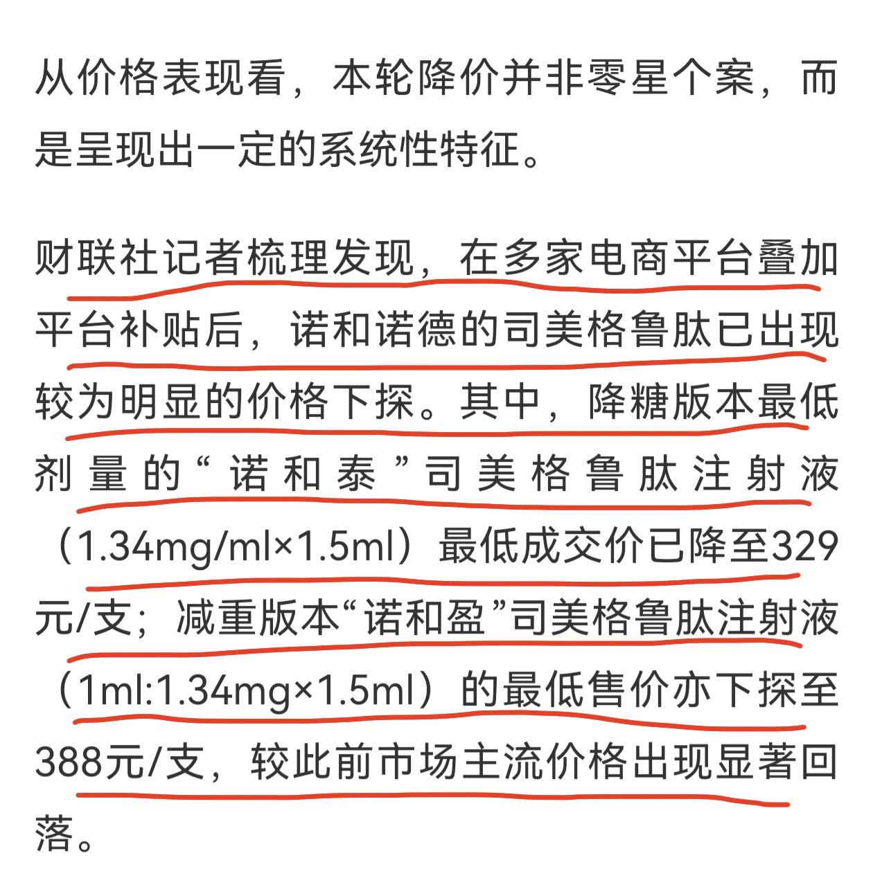 “减重神药”降价了!由跨国医药巨头诺和诺德和礼来发起的主动降价忽然而至,而且势头很猛,价格较半年前近乎减半,同时在电商平台和政府采购平台上演。电商平台上减重版司美格鲁肽(1ml:1.34mgx1.5ml)价格下探至388元/支。政府采购平台上减重版(2.27mg/mlx3ml)司美格鲁肽价格由1893.67元降到987.48元。 这分明就是一场阳谋,是一场精准的战略抢跑,因为国产的GLP—1类减肥药就在审批上市的路上,国际巨头这是提前布局竞争格局。作为知名的“重磅炸弹药物”,诺和诺德的司美格鲁肽,礼来的替尔帕肽卖的很好,也享受了高溢价,其核心专利2026年到期,到时中国药厂的产品要进入市场,竞争是难以避免的,所以索性降价锁定用药群体,将蓝海变成红海。 这对消费者是好事,但对不少进入减肥药赛道的企业确实是问题。今年创新药上市公司走出一波行情,减肥药概念表现亮眼,等待上市审批的,获得临床试验路条的,乃至将减肥药拿入项目管线的,只要有减肥药故事,股价就会上涨,估值已经很高了,现在产品还没上市,市场就面临激烈竞争,一旦行业预期反转,这些标的就面临调整压力,只有那些创新且独特疗效的产品具有竞争力,其他提供同质化产品的企业,股价回归之路还很长。