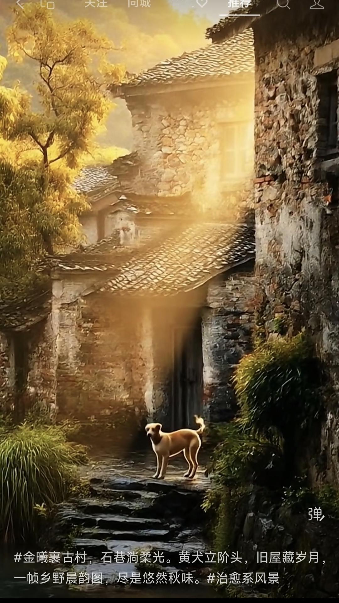 天净沙·乡野秋晨 金曦笼罩村乡, 石街轻淌柔光。 黄犬阶头静望。 旧屋幽藏, 秋
