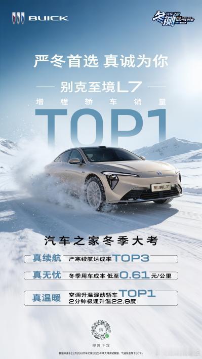 兄弟们!汽车之家2025牙克石冬测成绩单一出来,正好看到刚刚拍摄完的别克至境L7。这表现,说是“北方冬日战车”都行了!增程绝对是北方冬天用车的最优解之一,这次-25℃极寒实测直接锤了!全品类续航达成率TOP3,58.45%的成绩甩同级几条街,满油满电能跑830KM,跨省返乡、周末滑雪压根不用在寒风里排队补能,续航焦虑?不存在的!制热效率真的强!混动轿车TOP1不是吹的!2分钟升温22.9℃,15分钟直接飙到36.9℃,手机预约预热,上车不用裹羽绒服哆嗦,暖风吹得人直犯困,这才是冬天开车该有的体验啊!大家很在意的用车成本这块,每公里才0.61元!比燃油车都省,一个冬天通勤下来,省出的钱够炫好几顿排骨了,兼顾续航和省钱,很良心。那些说“新能源车冬天不能买”的,这会看了成绩应该没啥说了吧!至境L7的真龙增程把“稳、暖、省”做到了极致,技术好不好,落地体验才行。北方车主想买车的,真正懂冬天用车需求的才是好车!别克至境L7大v聊车