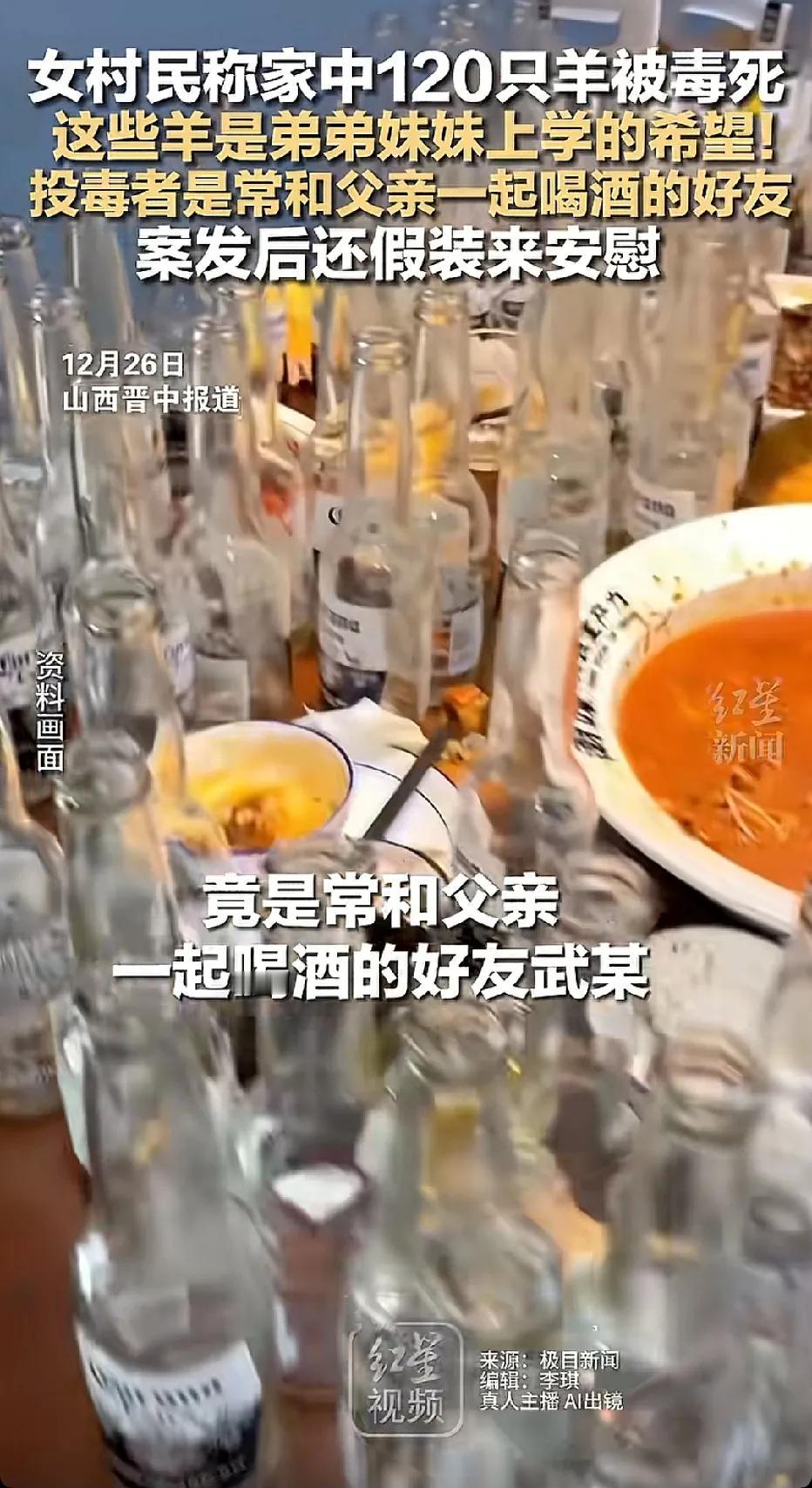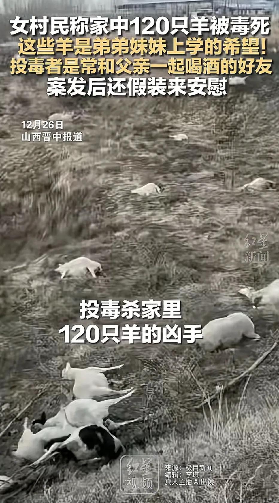 熟人!这两个字,看到这个新闻,后背发凉!一村民家中的羊🐏,有120只被人投毒毒死,而那个投毒的人竟然是经常和这位村民的父亲一起常年喝酒的好朋友!! 最可怕的是,这位所在的“熟人好友”,事发后,还假惺惺的来安慰他们家,真的是人前一套,背后……这种人,真的太阴暗和可怕了,关键他还表面上表现出关心和友善。 看了新闻更令人气愤的是,养这些羊太不容易了,这些羊可是这家小孩上学的费用来源啊!120只羊,这得多少收入?那个“熟人”能赔得起?就怕还赔不起,这损失太大了。 看到有网友说:越是熟人,他越见不得身边的人比他自己好。也有网友说:只要熟人他不害你,基本上就没有其他人能害你,这句话的含金量,越来越高了。 当然,我们也理性看待,这不代指所有的“熟人”,我相信,好人还是很多的,大部分的人都比较善良,只是,也要防范之心比较好。大家怎么看待这件事?