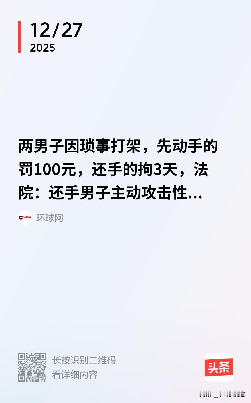 广西柳州,市场里两家摊主,因为一辆手推车起了口角。甲推落了乙的货物,乙气不过,打了甲一拳。甲挨打后挡了一下,向后退去。这时,乙并没有追上来。不料,甲突然猛冲上去,一把将乙摔倒在地,接着按住乙的头,狠狠往水泥地上撞了好几下,直到旁观的邻居惊呼上前,他才喘着粗气松了手。事后,先动手打一拳的乙,被罚了100元。而后来动手的甲,却被拘留了3天。甲觉得委屈:不是他先打我的吗?我还手怎么反倒罚得更重?事后,甲告上法庭,坚称自己是正当防卫,要求撤销拘留处罚。法院这样判决。   某农贸市场里,赵某和钱某的摊位比邻而居,一个主要卖些日用杂货,另一个经营着蔬菜生意。   平日里,两家虽不算亲密,但倒也相安无事,直到2024年4月那个燥热的上午,一个顾客的手推车,激起了意想不到的波澜。   那天上午十点左右,一位在钱某菜摊前选购的顾客,将自家的手推车临时停放在了摊位旁稍靠外的位置,多少有些挡住了通道。   正在自家杂货摊前理货的赵某看到,觉得这车子碍事,影响通行,也没多想,径直走过去,将那辆手推车推到了远处一个角落。   这一举动,被刚结完账的钱某看了个正着。   生意人最讲“和气生财”,但也最在意“门面”和“客源”,在他看来,赵某的行为无异于在赶自己的客人。   钱某心头火起,隔着摊位就冲赵某喊了一句:“你动我顾客的车子搞什么?”   赵某正在忙活,被这么一呛,也没好气地回了一句:“放那里挡路了,看不见吗?”   简单的口角迅速升级为相互的辱 骂,周围的摊主和顾客纷纷侧目。   争吵中,情绪上头的赵某一步跨到钱某的摊位前,伸手将台面上几捆包扎好的蔬菜扫落在地。青翠的菜叶散落一地。   钱某只觉得血往头上涌,再也按捺不住,隔着摊位,一拳就朝着赵某的面门挥了过去。   这一拳结结实实地打在了赵某抬起格挡的手臂上,赵某被打得向后踉跄了两步,才稳住身形。   然而,就在众人以为冲突可能暂停,或者会有人劝架时,局面急转直下。   钱某挥出那一拳后,站在原地,胸膛起伏,似乎没有立即继续追打的意图。   可赵某在后退两步、稳住身体后的反应,超出了很多人的预料,他没有选择指着对方理论,没有转身离开,甚至没有大声呼喝制止,而是几乎没有任何停顿,一个箭步猛冲上前!   赵某凭借冲劲和体格优势,一把抓住钱某还没来得及收回的手腕,顺势一个猛拽,利用巧劲和冲力,直接将钱某摔倒在地!   这还没完,将钱某摔倒在地后,赵某并没有松手,而是就势用膝盖和身体压住对方,腾出一只手,死死按住钱某的头部,朝着坚硬的地面用力撞击了数下!   “砰、砰”的闷响,伴随着钱某短促的痛呼,周围的人群发出一阵惊呼,有人大喊“别打了!出人命了!”   钱某在地上奋力挣扎、扭动,试图摆脱控制,用手护住头部。   赵某最终松开了手,喘着粗气站了起来。   倒在地上的钱某,额头和脸颊已见了血,在旁人的搀扶下勉强坐起,他立刻掏出了手机报警。   经医院检查鉴定,钱某的损伤程度构成了轻微伤。   事后,警方组织了调解,但在调解室里,赵某坚持认为自己只是“还手”,是对方先动的手,自己顶多是防卫过当,不愿意承担主要的赔偿份额。   而钱某则认为自己虽然先动手,但赵某后续行为远超必要,导致自己受伤,要求较高的赔偿。   几轮下来,双方意见差距太大,调解以失败告终。   随后,警方对于先动手打人一拳的钱某,处以罚款100元的行政处罚,而对于赵某,则作出了行政拘留3日的决定。   赵某收到处罚决定书后,深感委屈,在他看来,自己是“被迫还击”,怎么反而受到了更重的处罚?   赵某认为自己的行为属于正当防卫,遂一纸诉状,将公安机关告上了法院,请求法院撤销对其行政拘留3日的处罚决定。   法院会如何判决呢?   《治安管理处罚法》第四十三条第一款规定,殴打他人的,或者故意伤害他人身体的,……情节较轻的,处五日以下拘留或者五百元以下罚款。   法院指出,正当防卫必须针对“正在进行”的不法侵害。   本案中,钱某挥出一拳后,并未表现出持续攻击的意图与动作,在赵某格挡并后退后,该次具体的侵害行为在客观上已告一段落,现实且紧迫的危险性已显著降低甚至消除。   防卫行为必须具有必要性,且手段应与侵害相当。面对已暂停的侵害,赵某本可通过保持距离、离开现场或报警等平和方式解决问题。   然而,赵某选择主动上前,将对方摔倒在地并多次撞击其头部,远远超出了制止先前那一拳所必需的程度。   法院认为,赵某的行为不具备防卫的被动性与克制性,而是在侵害暂停后主动发起的新的攻击,这完全符合“殴打他人”的违法构成。   鉴于赵某仅造成了钱某轻微伤,且钱某也存在一定过错,法院认定本案属“情节较轻”,对赵某处以行政拘留三日,处罚适当。   最终,法院判决驳回赵某的全部诉求。   对此,您怎么看?