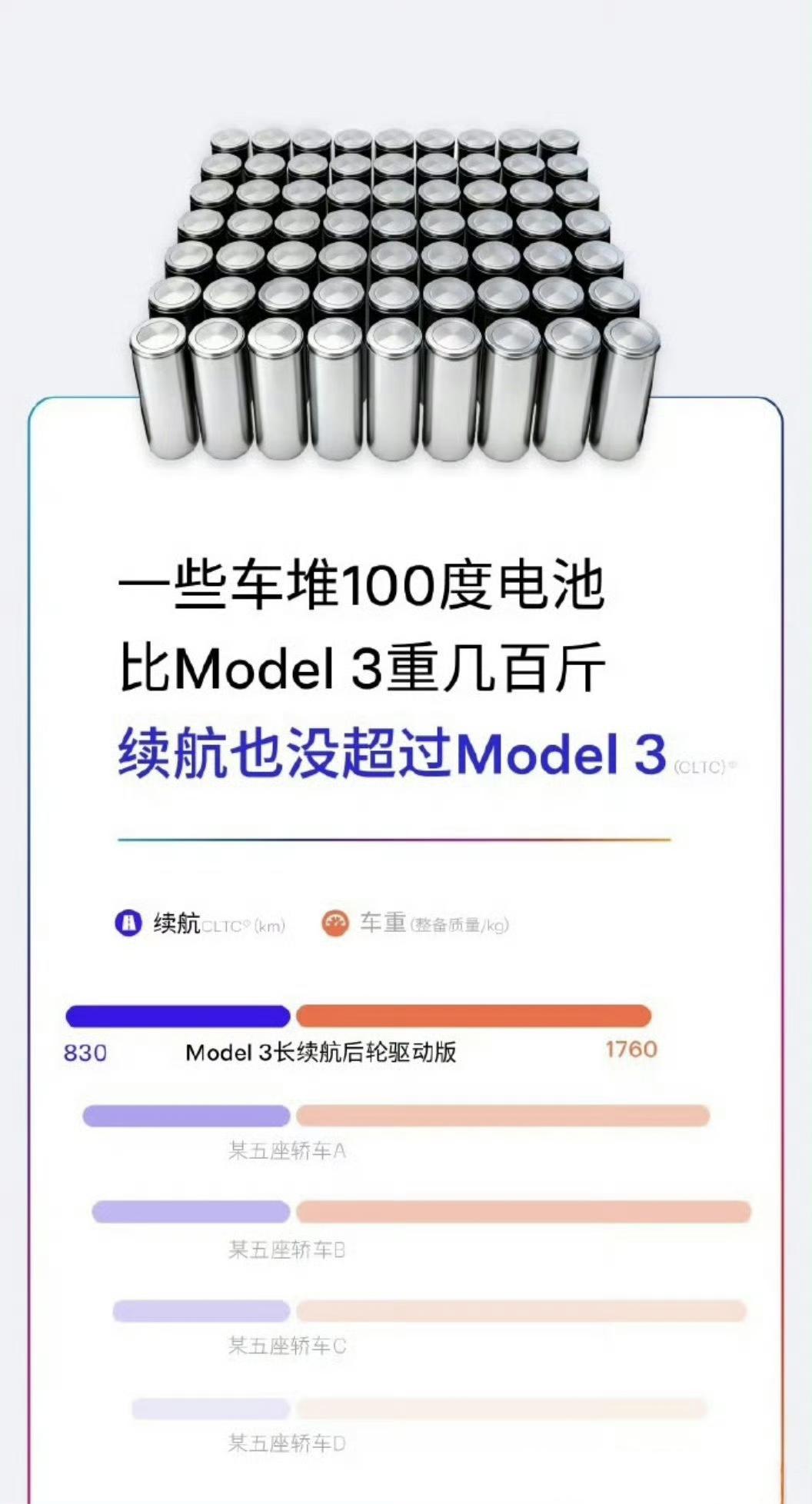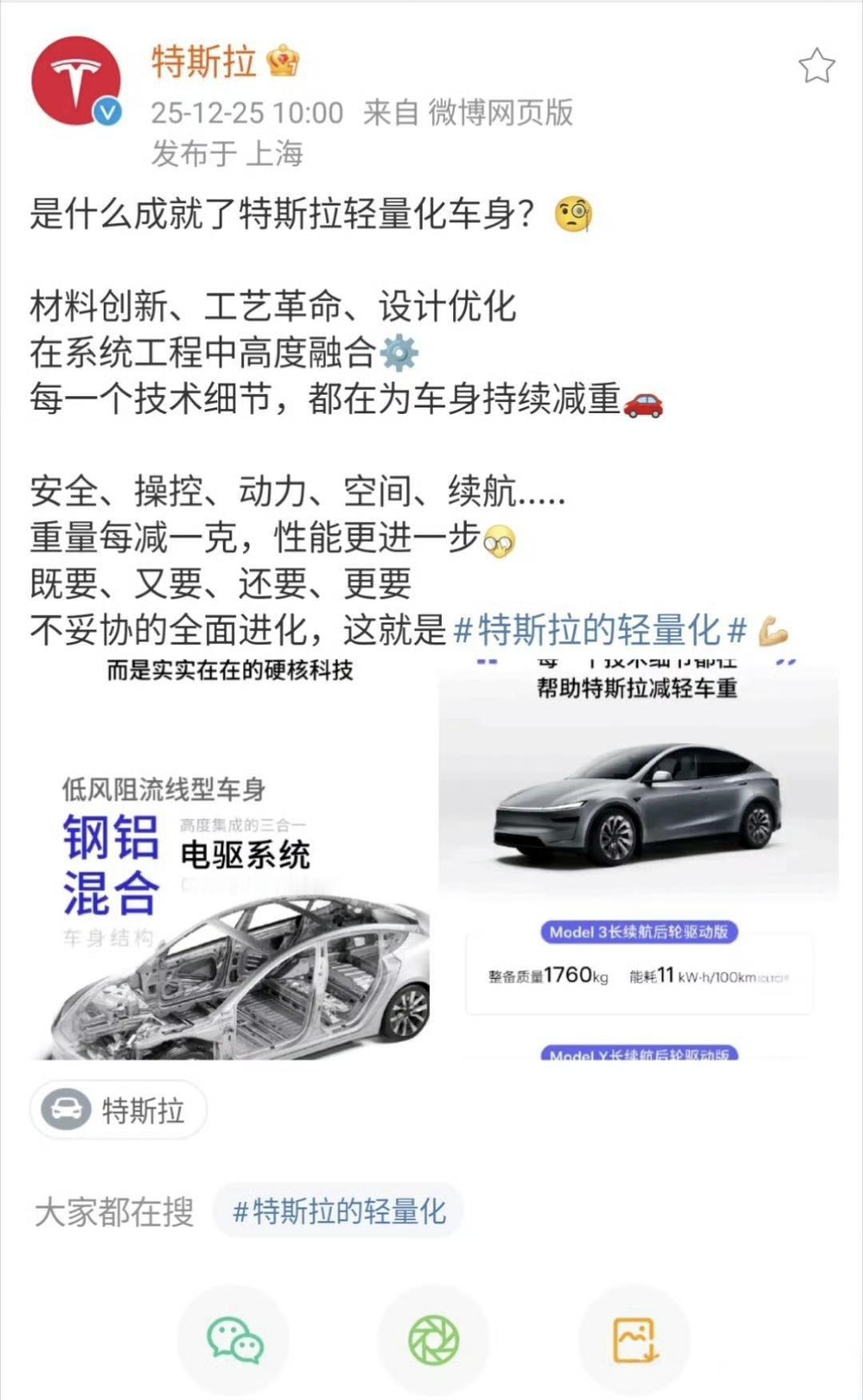 特斯拉的轻量化 特斯拉今天连发两条微博: 一条吹自己的轻量化,讽刺那些堆大电池的