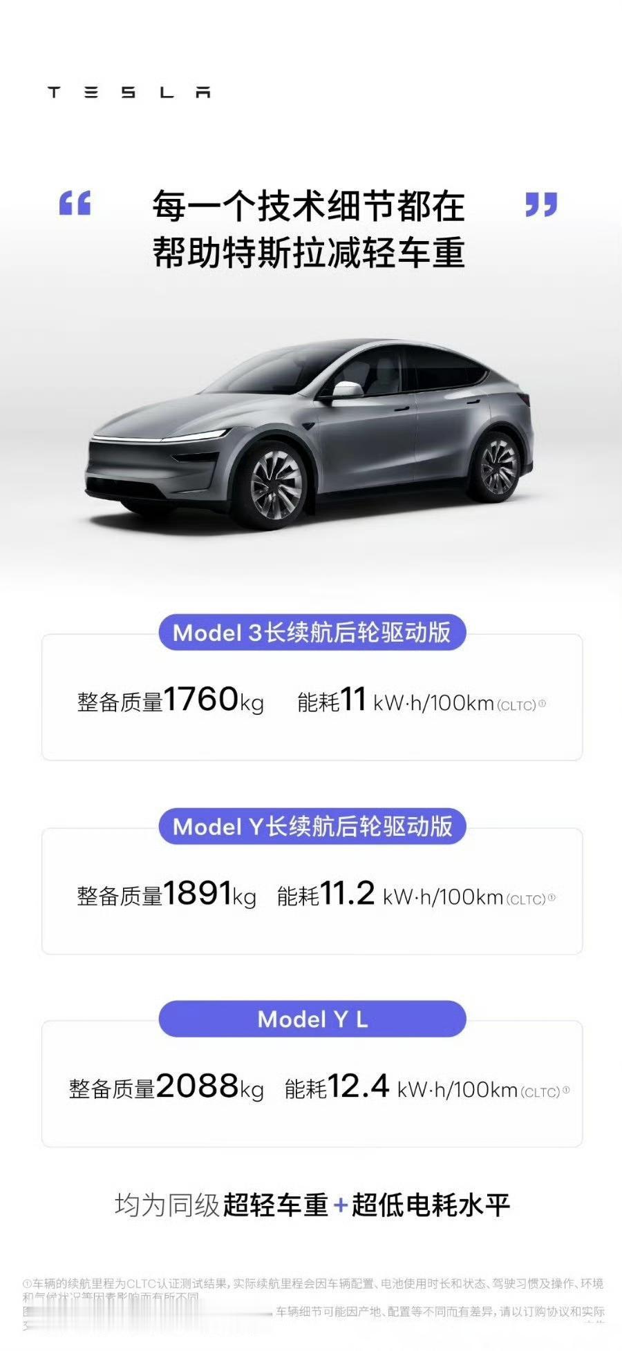 特斯拉的轻量化 特斯拉今天连发两条微博: 一条吹自己的轻量化,讽刺那些堆大电池的; 一条抨击没有自动驾驶的车是大哥大。 特斯拉轻量化确实是他的优势,主力车型Model3和ModelY都不超过2吨,六座车ModelYL也只有2吨左右。 而对比现在国内很多车,堆100度大电池可能也没有特斯拉跑得远。 特斯拉的轻量化说白了主要依靠一体化大压铸,减重明显; 还有就是配置简单,这一块也省重,比如没有冰箱,这不就省几十斤了。 第三点是各种集成化部件,电驱,热管理都是高度集成式的,这也省了不少重量。 电车还是要越做越轻,以后电车说不定会按照重量征收“养路费”。【来自懂车帝车友圈】