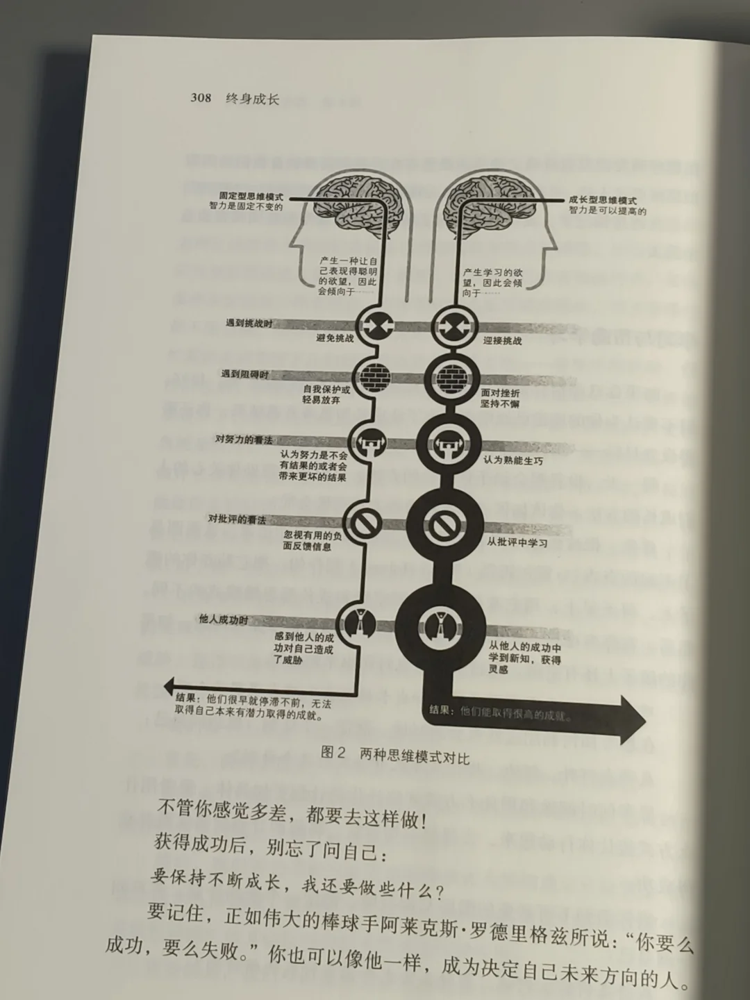 书里介绍了固定型和成长型这两种思维模式,简直像两条岔路,决定了我们面对成功失败、挑战机遇时的不同走向。作者研究发现,成长型思维的人更容易实现人生和职业目标,不管是在校园、职场,还是处理婚恋、亲子关系,这种思维都超关键。