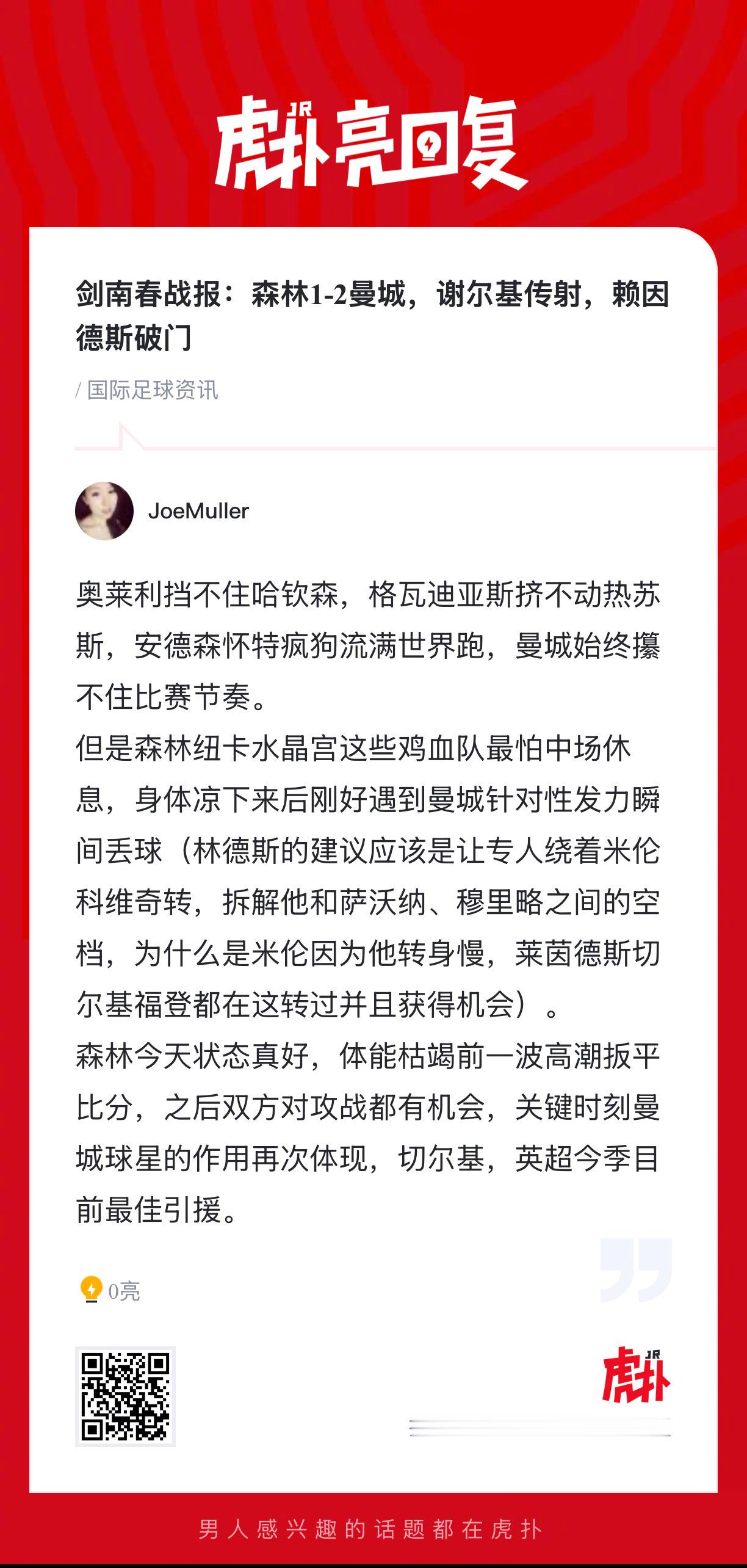 诺丁汉森林1比2曼城哈兰德赛后收获9.5的虎扑评分!