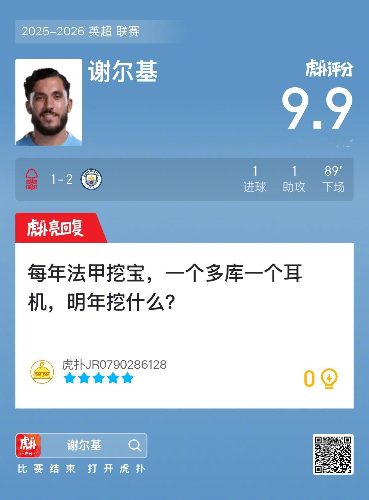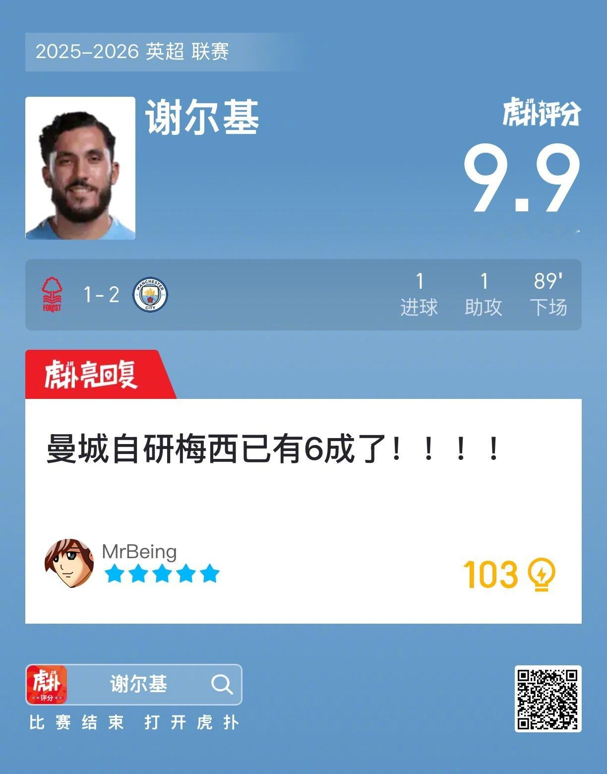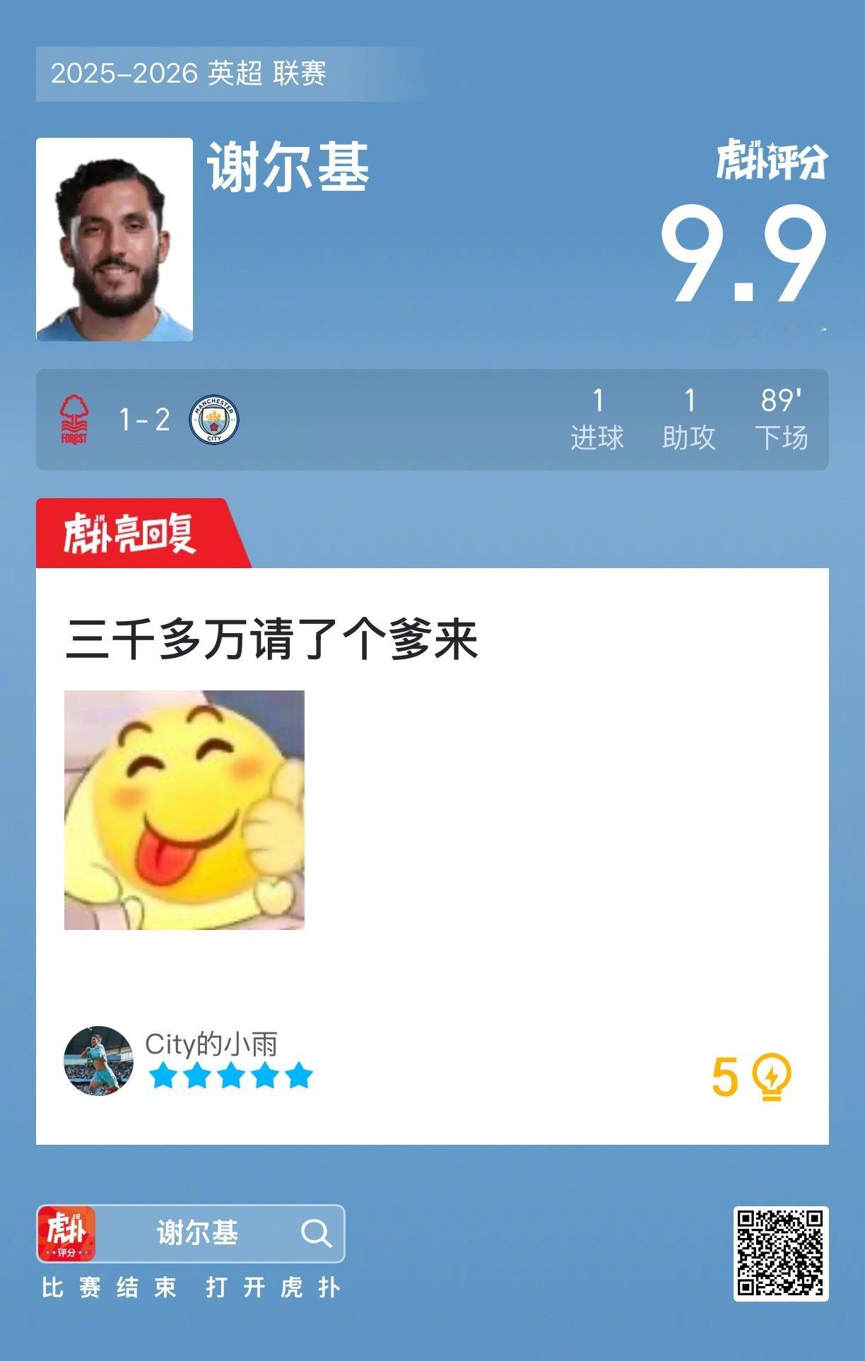 诺丁汉森林1比2曼城谢尔基打进一球贡献一次助攻,赛后收获9.9的虎扑评分!