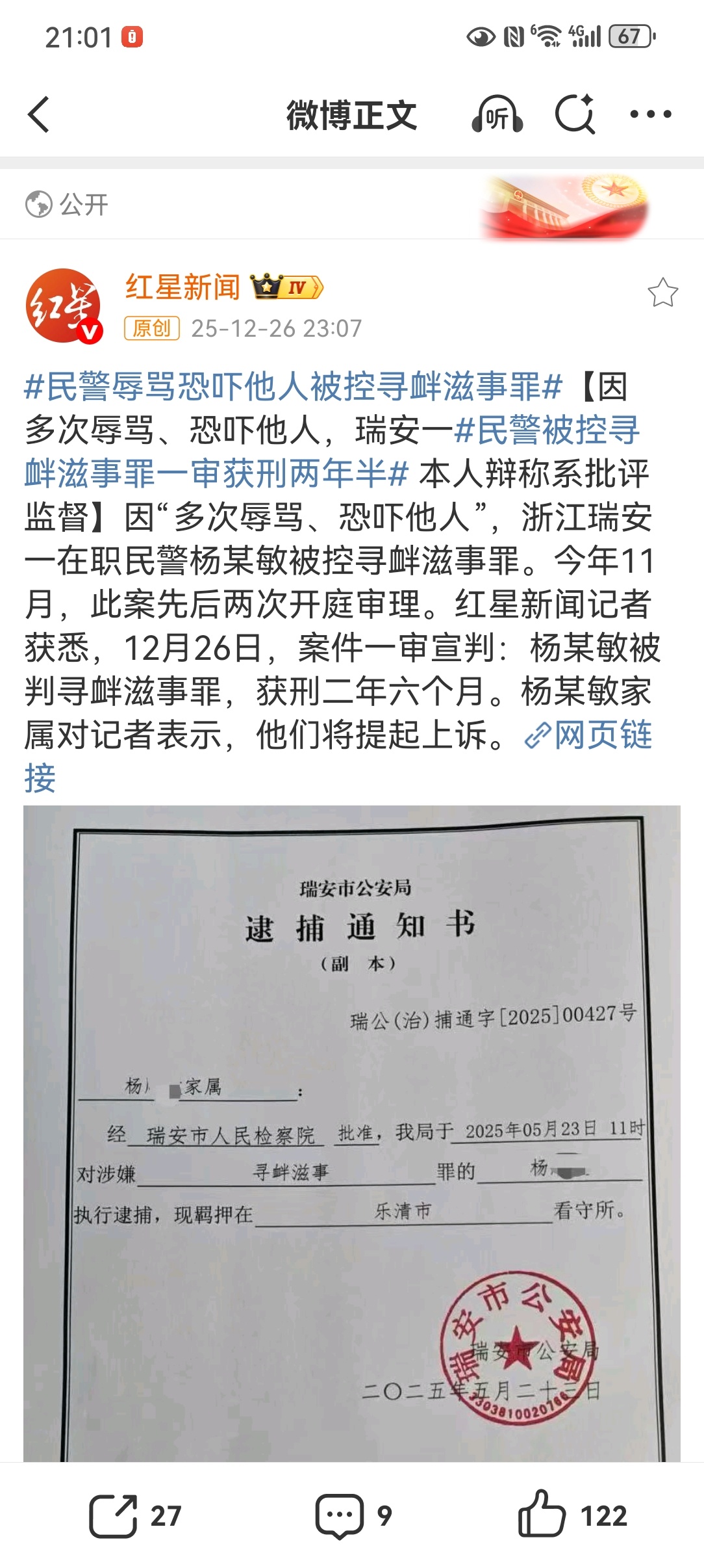 民警辱骂恐吓他人被控寻衅滋事罪【因多次辱骂、恐吓他人,瑞安一民警被控寻衅滋事罪一审获刑两年半 本人辩称系批评监督】浙江瑞安一在职民警杨某敏,因“多次辱骂、恐吓他人”被控寻衅滋事罪。经审理,法院一审判决其有期徒刑二年六个月。杨某敏本人曾辩称其行为系“批评监督”,其家属表示将上诉。全网热点共创计划 此案极具标志意义。长期备受争议的“寻衅滋事”罪名,此次精准适用于执法者自身,生动诠释了“法律面前人人平等” 的原则。它清晰传递出一个信号:执法者的权力边界由法律设定,其违法行为不仅不能豁免,更应因身份的特殊性而受到更严苛的审视。这对规范执法行为、重塑执法权威,具有深远而积极的警示作用。