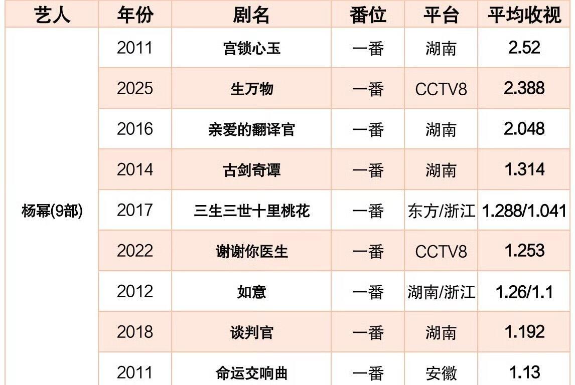 杨幂一番收视破1电视剧合计9部一番收视破2电视剧合计3部!位列同期女星第一!这个成绩,完全超级收视女王