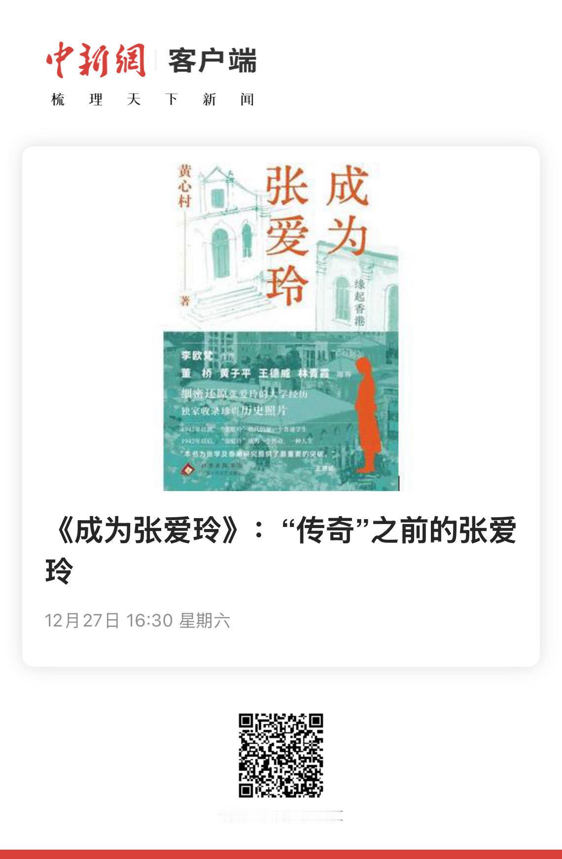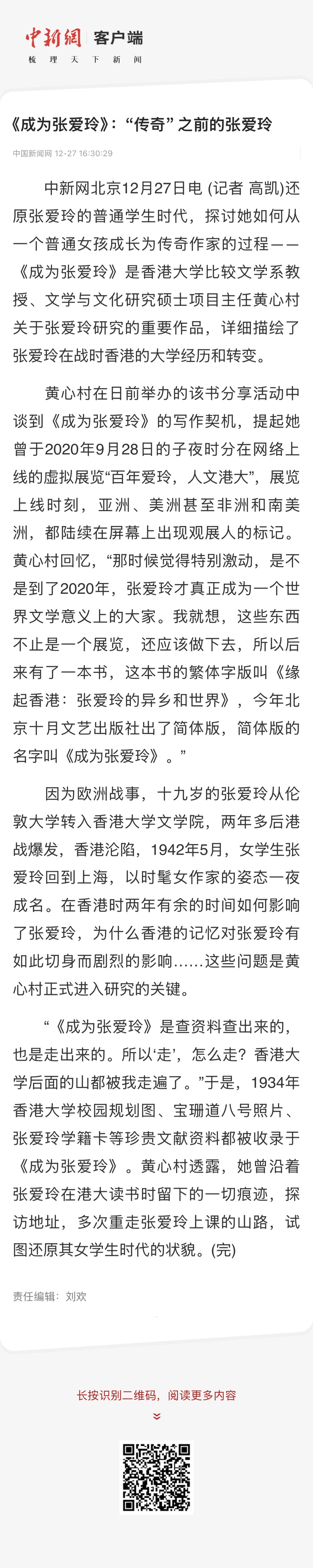 【 《成为张爱玲》:“传奇”之前的张爱玲】 (中国新闻网 2025年12月27日 星期六) 中新网北京12月27日报道: 还原张爱玲的普通学生时代,探讨她如何从一个普通女孩成长为传奇作家的过程——《成为张爱玲》是香港大学比较文学系教授、文学与文化研究硕士项目主任黄心村关于张爱玲研究的重要作品,详细描绘了张爱玲在战时香港的大学经历和转变。 黄心村在日前举办的该书分享活动中谈到《成为张爱玲》的写作契机,提起她曾于2020年9月28日的子夜时分在网络上线的虚拟展览“百年爱玲,人文港大”,展览上线时刻,亚洲、美洲甚至非洲和南美洲,都陆续在屏幕上出现观展人的标记。黄心村回忆,“那时候觉得特别激动,是不是到了2020年,张爱玲才真正成为一个世界文学意义上的大家。我就想,这些东西不止是一个展览,还应该做下去,所以后来有了一本书,这本书的繁体字版叫《缘起香港:张爱玲的异乡和世界》,今年北京十月文艺出版社出了简体版,简体版的名字叫《成为张爱玲》。” 因为欧洲战事,十九岁的张爱玲从伦敦大学转入香港大学文学院,两年多后港战爆发,香港沦陷,1942年5月,女学生张爱玲回到上海,以时髦女作家的姿态一夜成名。在香港时两年有余的时间如何影响了张爱玲,为什么香港的记忆对张爱玲有如此切身而剧烈的影响……这些问题是黄心村正式进入研究的关键。 “《成为张爱玲》是查资料查出来的,也是走出来的。所以‘走’,怎么走?香港大学后面的山都被我走遍了。”于是,1934年香港大学校园规划图、宝珊道八号照片、张爱玲学籍卡等珍贵文献资料都被收录于《成为张爱玲》。黄心村透露,她曾沿着张爱玲在港大读书时留下的一切痕迹,探访地址,多次重走张爱玲上课的山路,试图还原其女学生时代的状貌。 ()网页链接