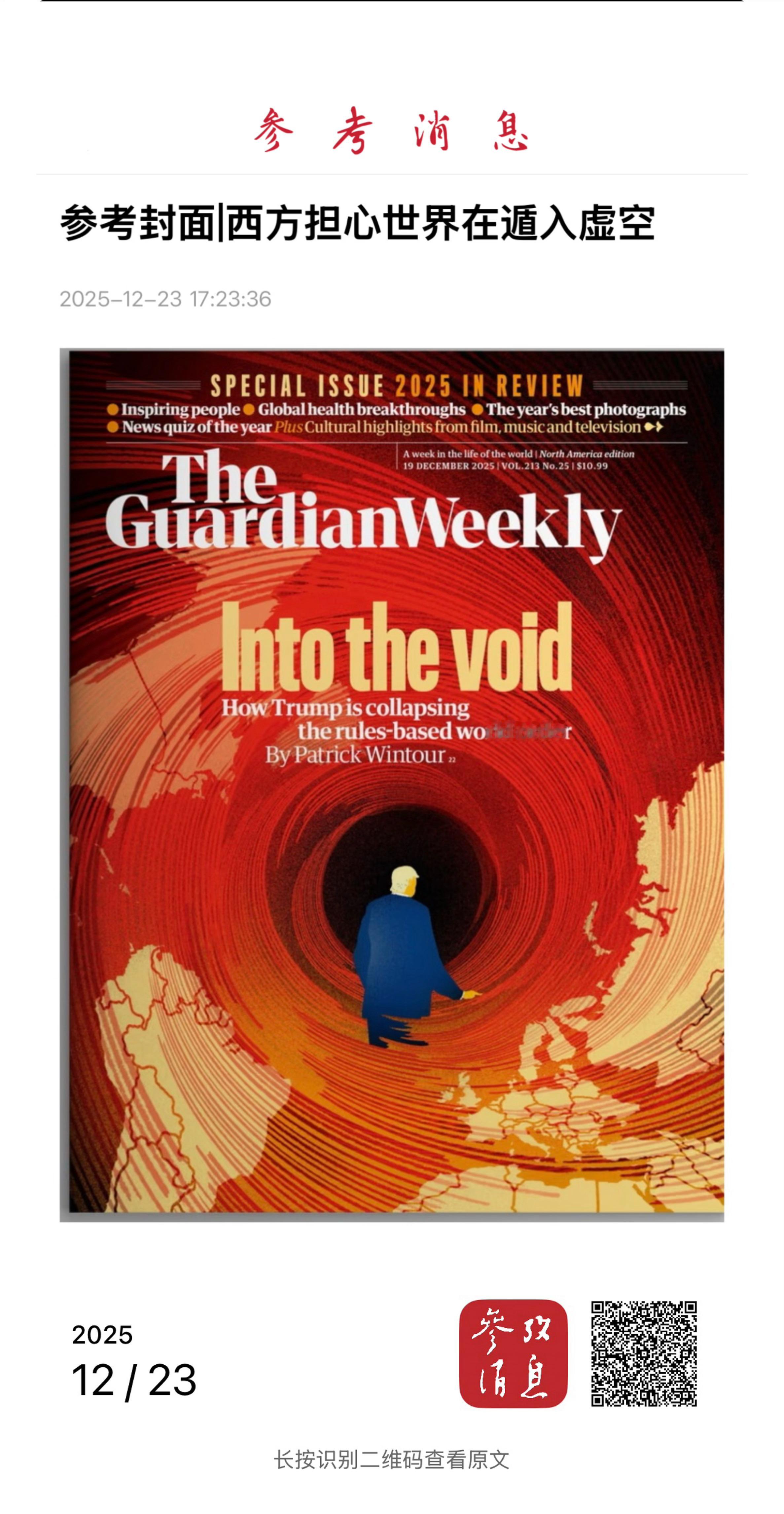 【 参考封面 | 西方担心世界在遁入虚空 】 (参考消息 2025-12-23 17:23:36 ) 参考消息网12月23日报道 英国《卫报周刊》12月19日报道,随着2025年接近尾声,西方世界的一切结构仿佛都开始出现裂痕。全球前景似乎迎来前所未有的严峻时刻。二战结束后长期存在的秩序似乎正在瓦解,其标志是国际法遭遇合法性危机以及由唐纳德·特朗普推动的“黑帮外交”的兴起。西方领导人担心,如今的世界正处于一个过渡时期,或者说在遁入虚空:在这个时期,问责制逐渐丧失,各种规范也日益遭到破坏。网页链接