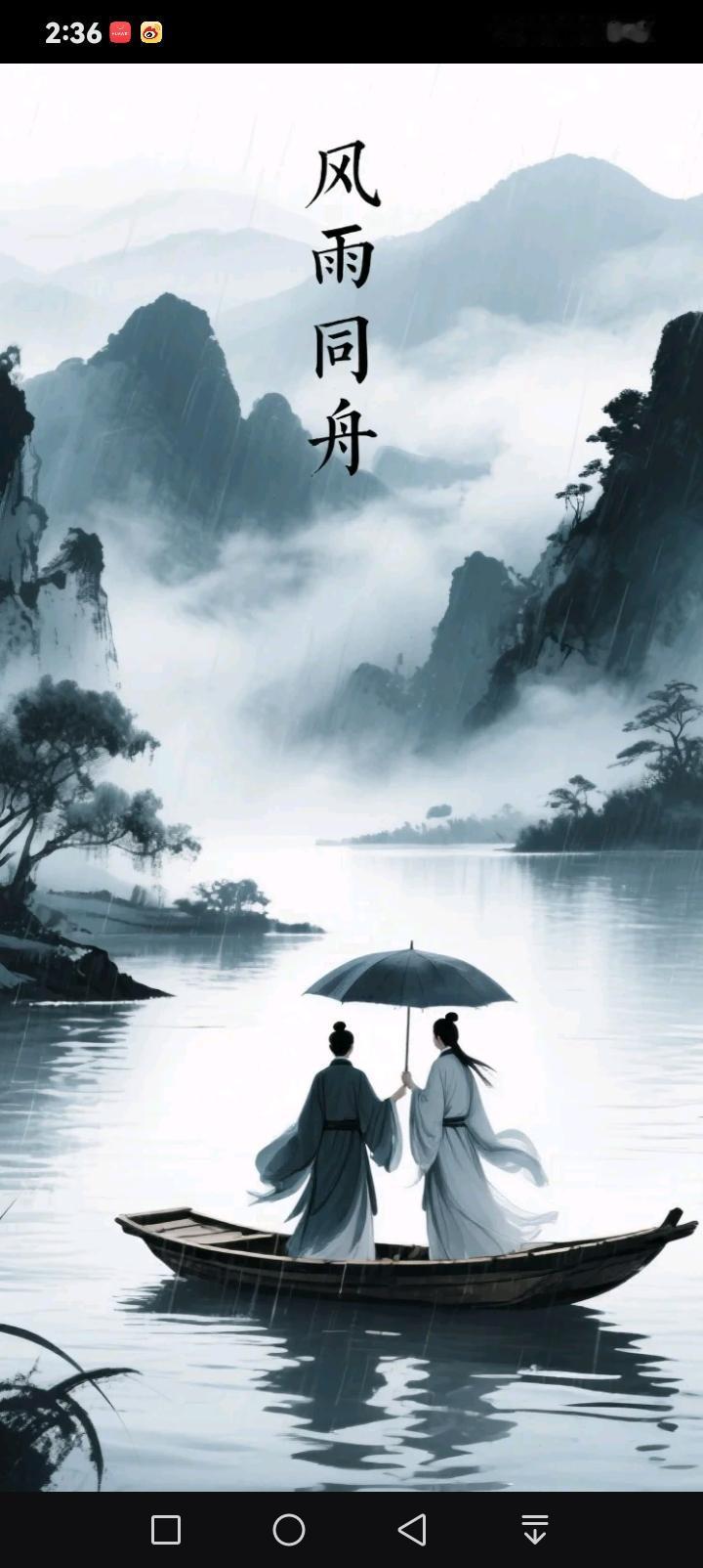 烟雨漫青山,扁舟渡平湖,二人执伞并肩,任风雨打湿衣衫,却共守一方晴暖。“风雨同舟”四字落于山水间,不是一时的相伴,是共经潮起潮落的笃定,是把彼此的路,走成同一条的温柔。岁月有风雨,所幸身旁有你,舟行万里,初心如故。