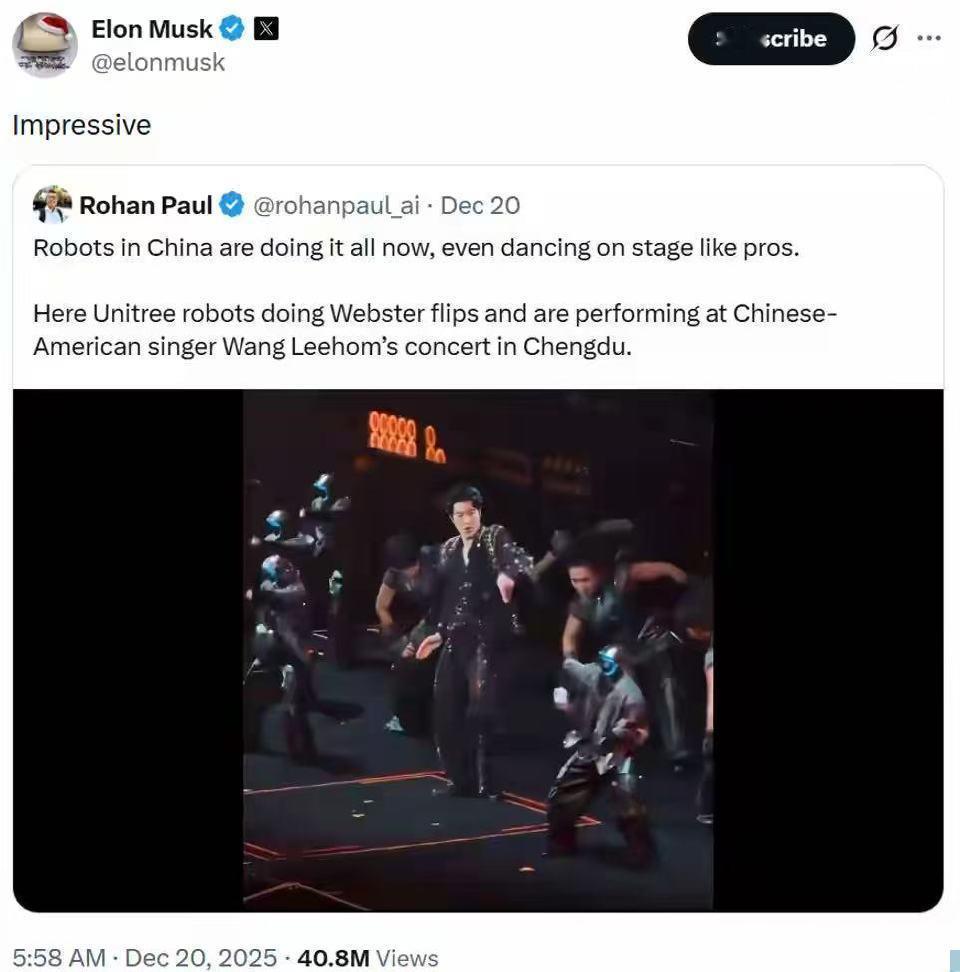 世界首富马斯克点赞宇树机器人,王兴兴回应! 事情是这样的。在王力宏的演唱会上,有几个叫G1的人形机器人上台伴舞,最后还来了个高难度的空翻。这段视频被马斯克看到,他转发了,就说了句“令人印象深刻”。结果,视频在全球的播放量一下子冲到了几千万。 宇树科技的创始人王兴兴后来接受采访,说大家的喜爱程度超出了他的预料。他觉得这对整个机器人行业都是件好事。但他也很清醒,马上补充说,现在远没到“机器人的ChatGPT时刻”。他的意思是,机器人还不能只靠听一句指令,就在陌生环境里完成大部分任务。要达到那个水平,可能还得再等两年左右。 不过,能让机器人完成空翻这种动作,本身已经挺厉害了。这需要协调身上十几个关节的自由度,做好动态平衡控制,据说光调试就花了三个月。现在这些机器人除了在舞台上表演,也开始用在一些景区做导览和巡检。 因为马斯克这一赞,资本市场也对机器人板块更关注了。宇树科技已经在做上市辅导,有可能成为“人形机器人第一股”。最近还有个挺逗的后续,特斯拉的一位工程师发了一段和G1机器人同步测试动作的视频,结果机器人模仿时,不小心“踢”了工程师一脚。马斯克看到又回了个“笑哭”的表情。 所以一个科技大佬的随口称赞,就像一阵大风,能把一艘小船瞬间吹到聚光灯下。但这阵风过后,船能不能继续航行,还得看它自己的技术和产品到底硬不硬。你觉得,这种来自顶流的“免费广告”,对一家创业公司来说,是机遇更多还是压力更大呢。冬日生活打卡季 马斯克AI计划 马斯克AI 马斯克ai智能 宇树机器人 机器人宇树科技 宇树科技机器人 马斯克AI团队