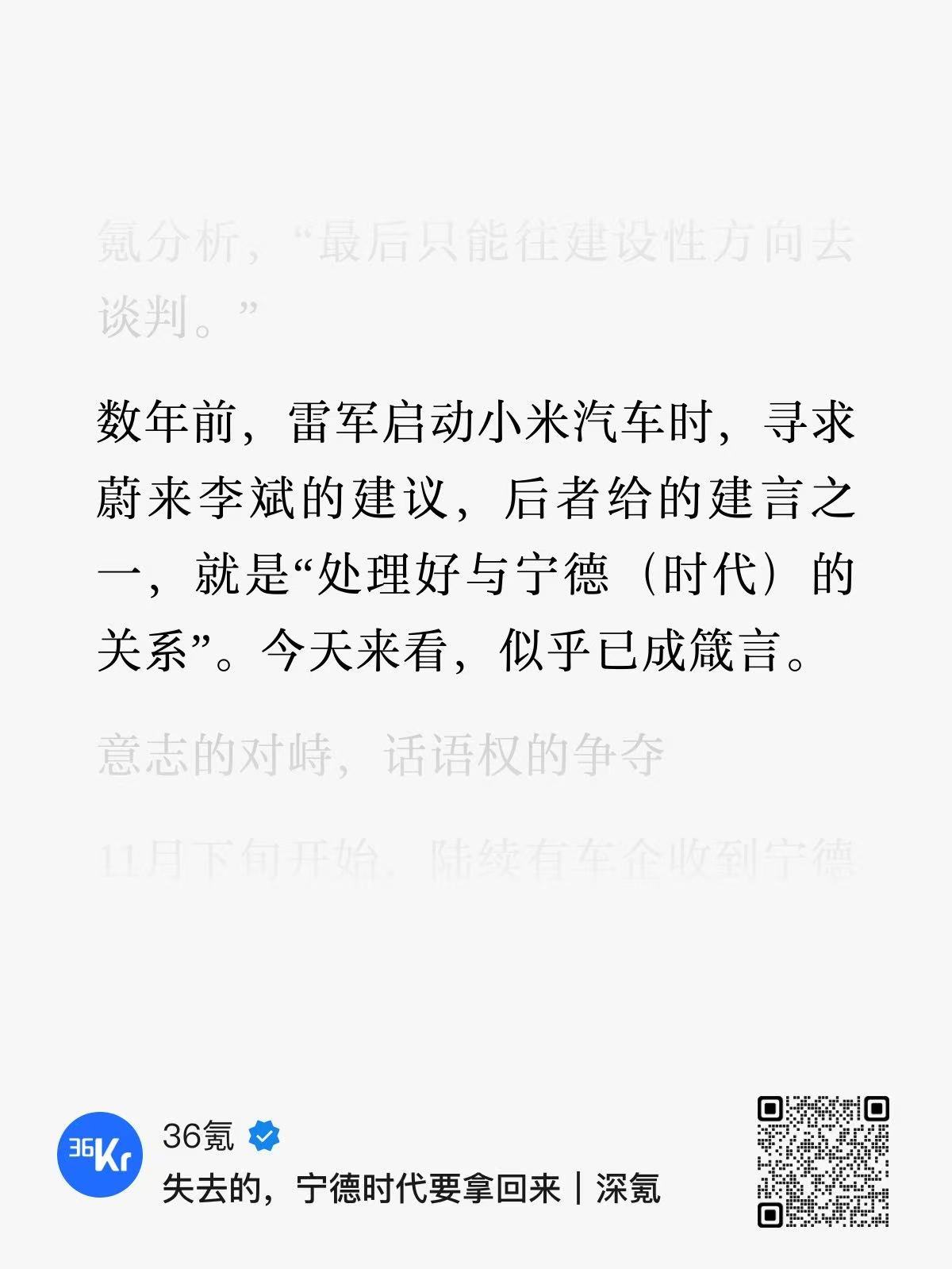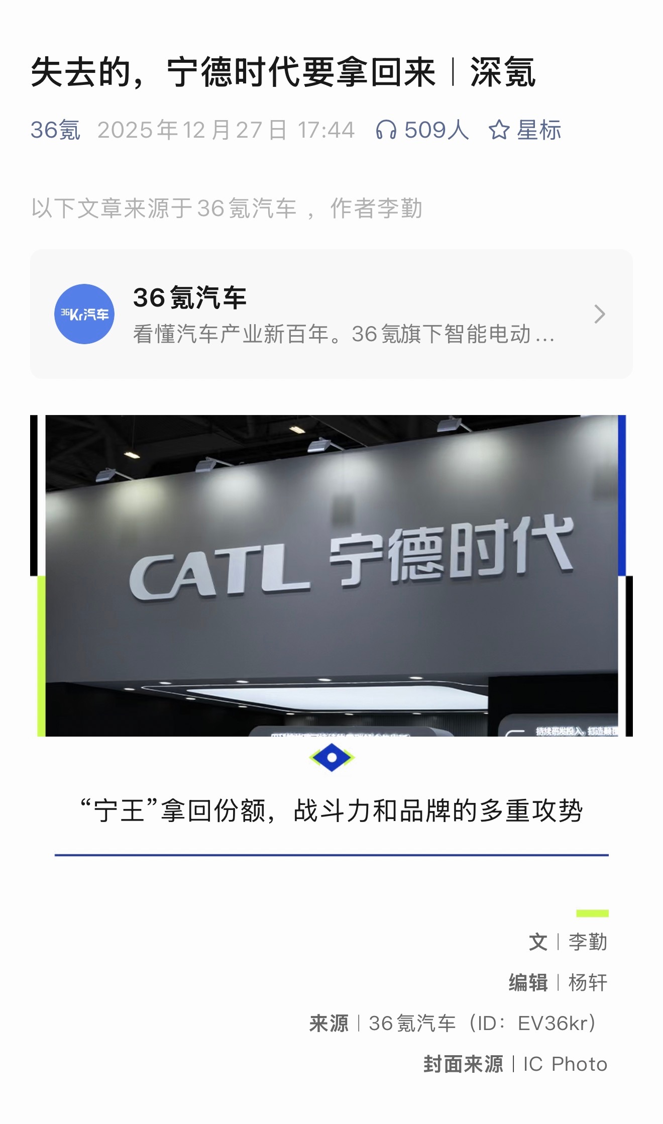 36氪:《失去的,宁德时代要拿回来》,写了这么几件“鲜活”的往事:-理想:理想这两年大力扶持欣旺达,份额给到了三成,这直接触及了宁德时代的防御红线。结果今年理想不顺,增程乏力,纯电i8、i6未上市时,导致宁德时代仓库里,最多时积压了两万套理想的电池。到了9月关键时刻,供应链突然传来消息:没货了,但产线没停。理想正准备推纯电新车i6,这谁受得了?9月18日 李想带队亲赴宁德,第二天就签了个5年合作协议。-蔚来蔚来2025年日子不好过,资金压力大。宁德时代这时候不仅没逼债,反而出手投资蔚来的能源业务,帮着缓解资金渴求。不仅是投资,宁德时代也在交付上支持蔚来。2025下半年,蔚来乐道L90和新款ES8热销爆单后,宁德时代在紧俏的产能中,从洛阳、溧阳等基地,向蔚来倾斜产线资源,以支持其新车交付。当然,回报也是丰厚的:蔚来乐道的新车订单,原本分给了几家供应商,现在停了弗迪,中创此前的100度电池,也切回给了宁德时代。-零跑以前零跑是二线电池厂的“后花园”。但今年零跑销量暴涨,二线厂产能跟不上,通常要两三个月才能交付。宁德时代这时候杀出来:我只要45天。结果就是,零跑的高配车型和新车订单,大把大把地流进了宁德时代的口袋。宁德时代甚至还有一招“阻击战术”:哪怕你把低配版给了别人,我也备好一套方案。万一对手掉链子,我立马补位。乐道的电池包就是这么被宁德时代“抢救”回来的,因为原定的供应商,让蔚来团队信心动摇。以前大家都觉得宁德时代贵。吉利有款热销小车“星愿”,宁德时代给出的电池报价极低,甚至比吉利的金砖电池成本还低20%。这得益于它极高的生产效率——别人一分钟生产节拍是20PPM,也就是每分钟生产20颗电芯,他是60PPM,能产60颗。匹配到星愿这样量大的车,可以快速降低BOM成本。从这篇文章里,大概能读出这样的结论:虽然车企们都在试图通过自研电池包、引入二线供应商来夺回话语权,不想当纯粹的“组装厂”。但在高端三元锂电池技术、大规模交付能力以及已经建立起来的C端品牌认知面前,宁德时代依然掌握着绝对的主动权。现在的宁德时代,正通过技术压制、产能卡位和品牌攻势,重新收复失地。对于车企来说,这既是必须依赖的“大腿”,又是时刻想要挣脱的“锁链”。